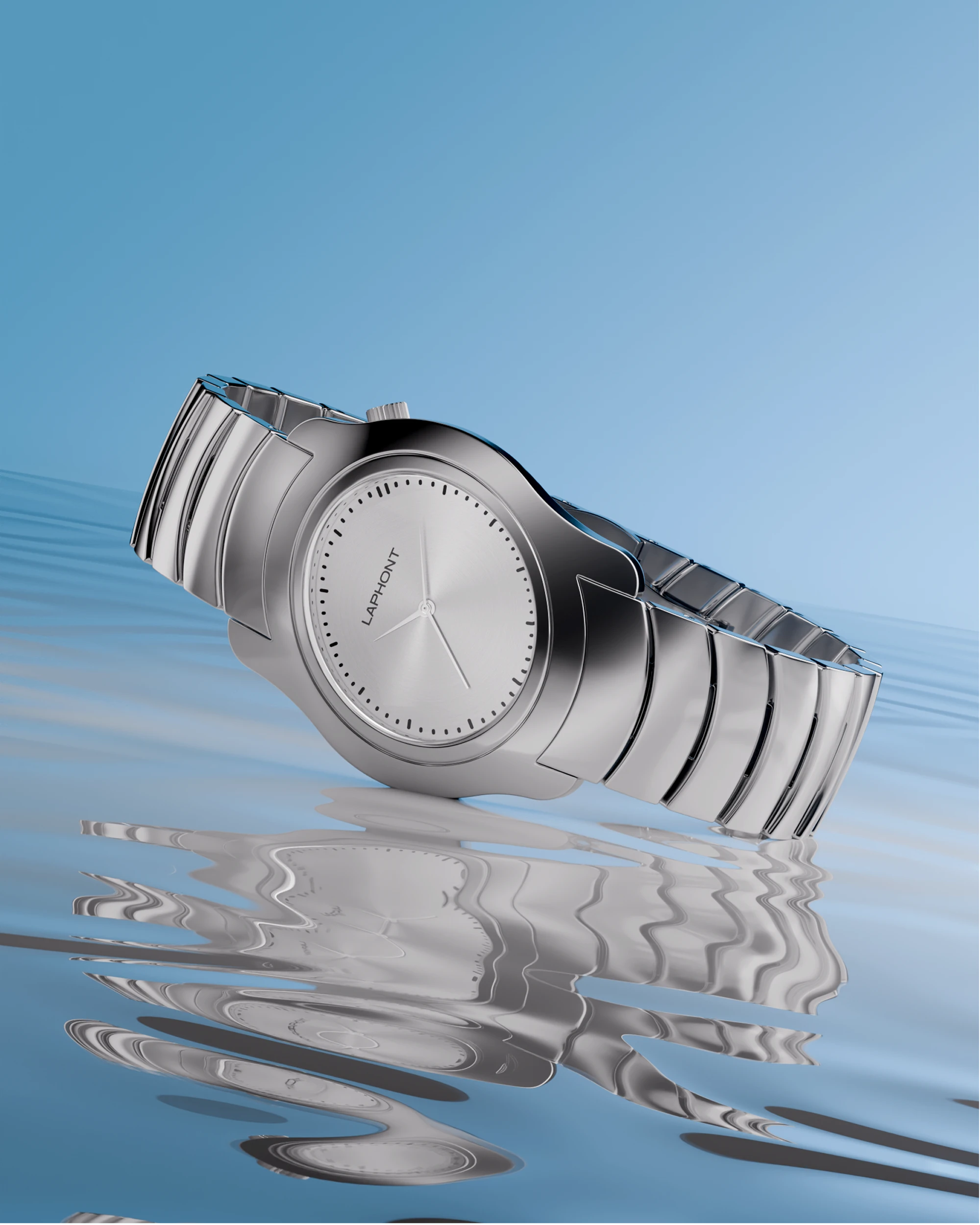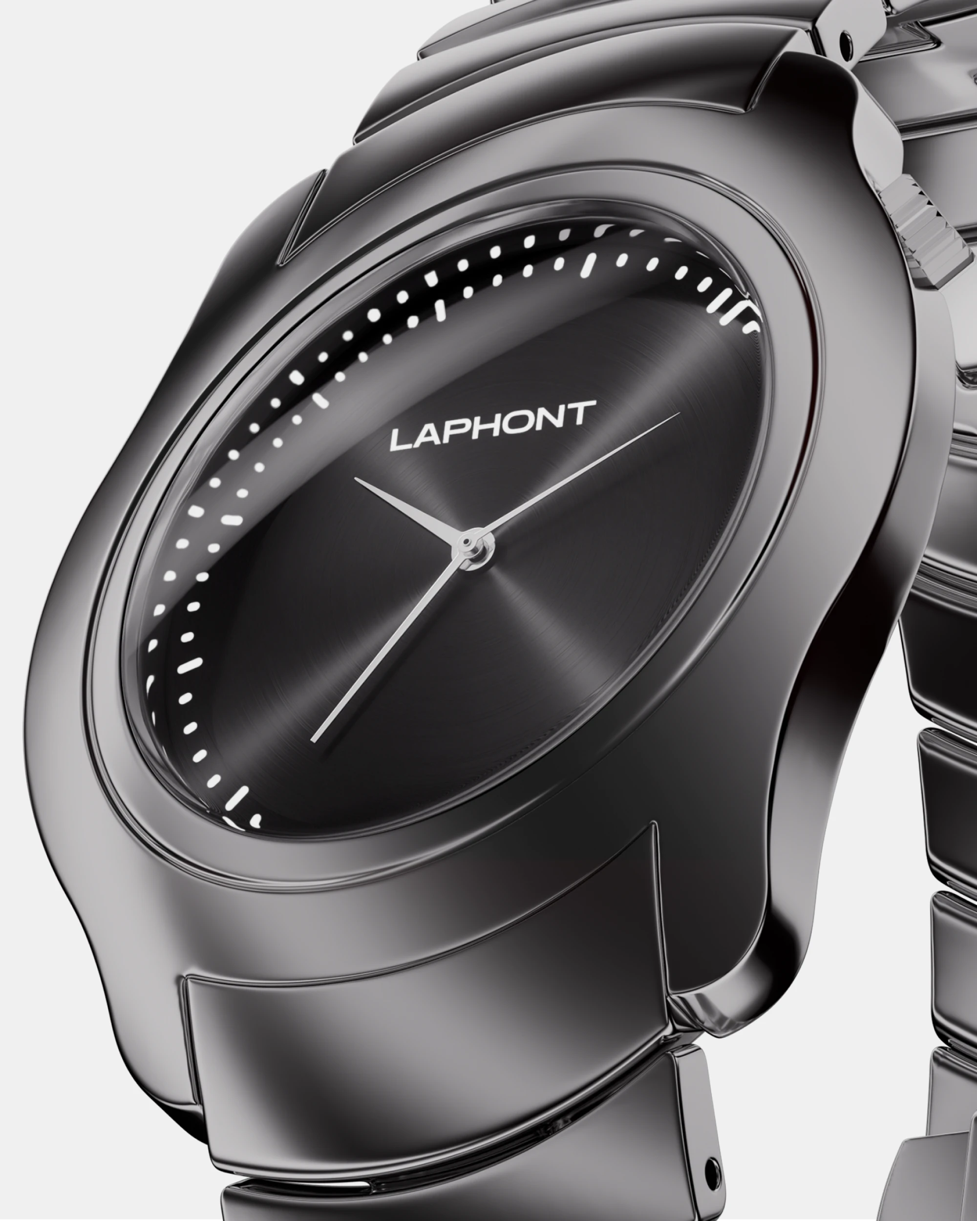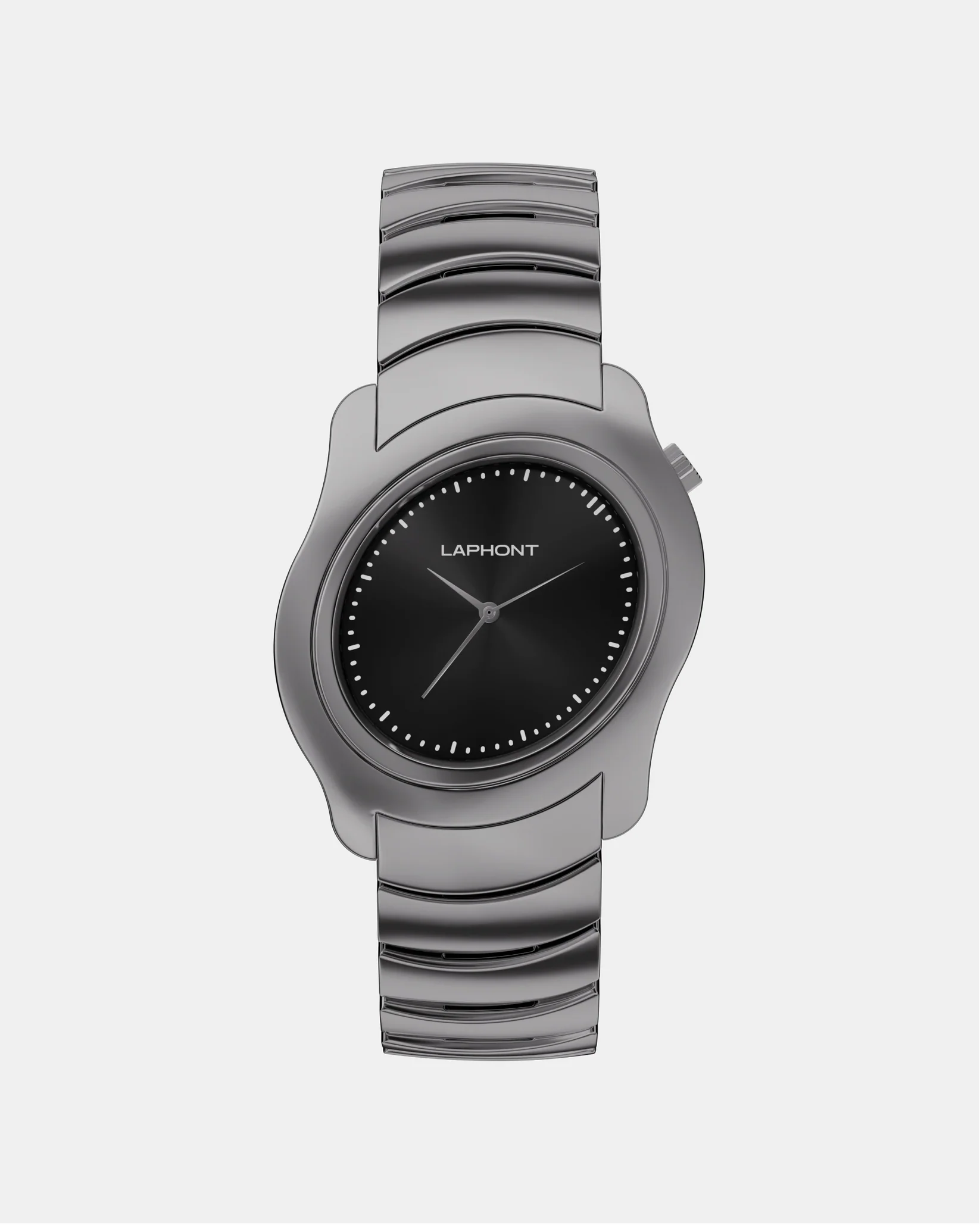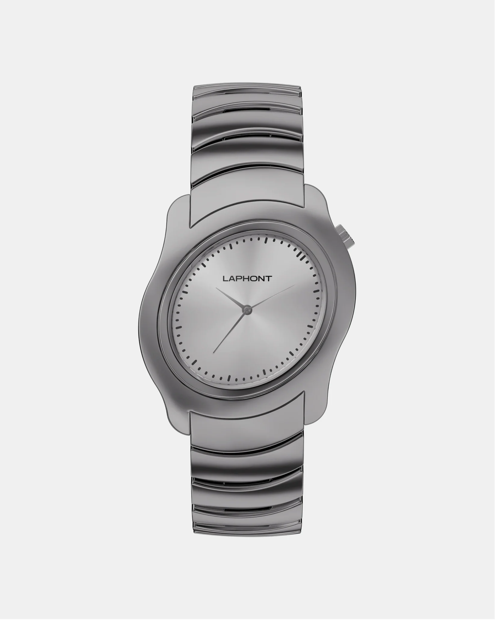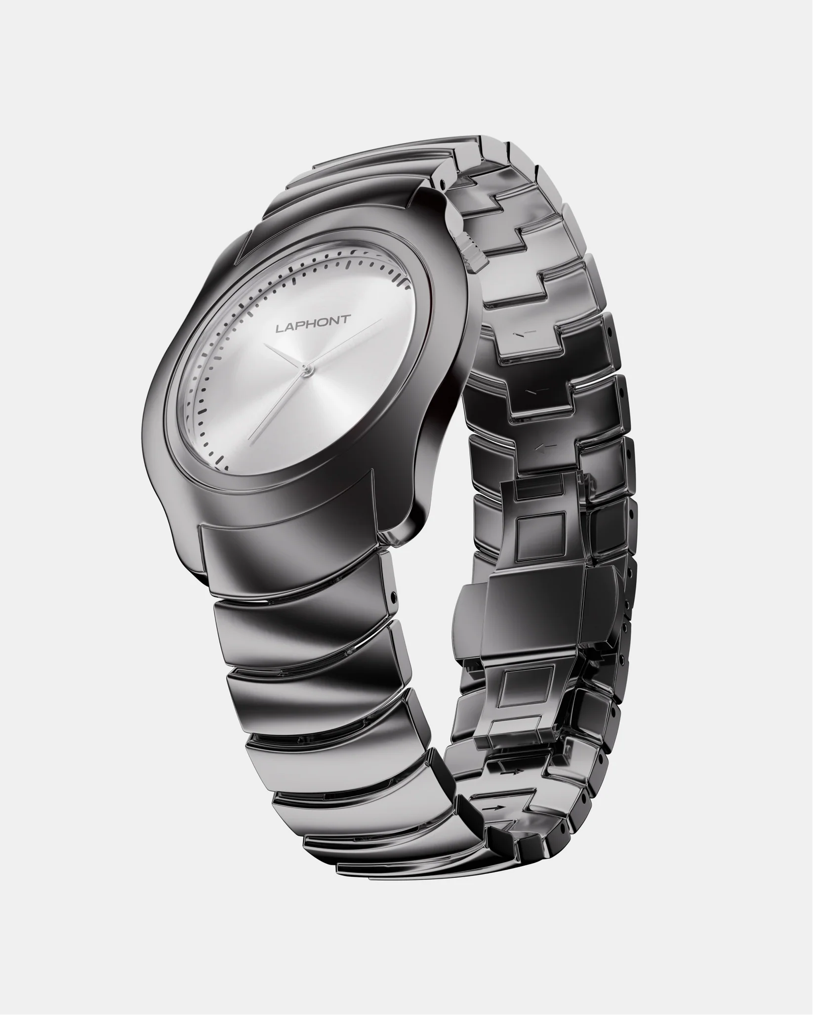 「SIDEWINDER」は、蛇行するような流線型フォルムをまとったアシンメトリー構造のメタルウォッチ。一見ミニマルでありながら、光の角度によって表情を変える有機的な造形は、まるで"呼吸するオブジェ"のように腕の上で生命感を放ちます。ステンレススチール製のケースは、直線と曲線が交錯する立体構造。全面を鏡面仕上げで磨き上げることで、金属の光沢そのものが造形美を際立たせ、見る角度や光の動きに呼応して豊かな表情を描きます。ケースと連続するように設計されたカスタムメタルブレスレットは、静と動のバランスを象徴し、LAPHONTが追求する"構築美としての時計"という哲学を体現しています。