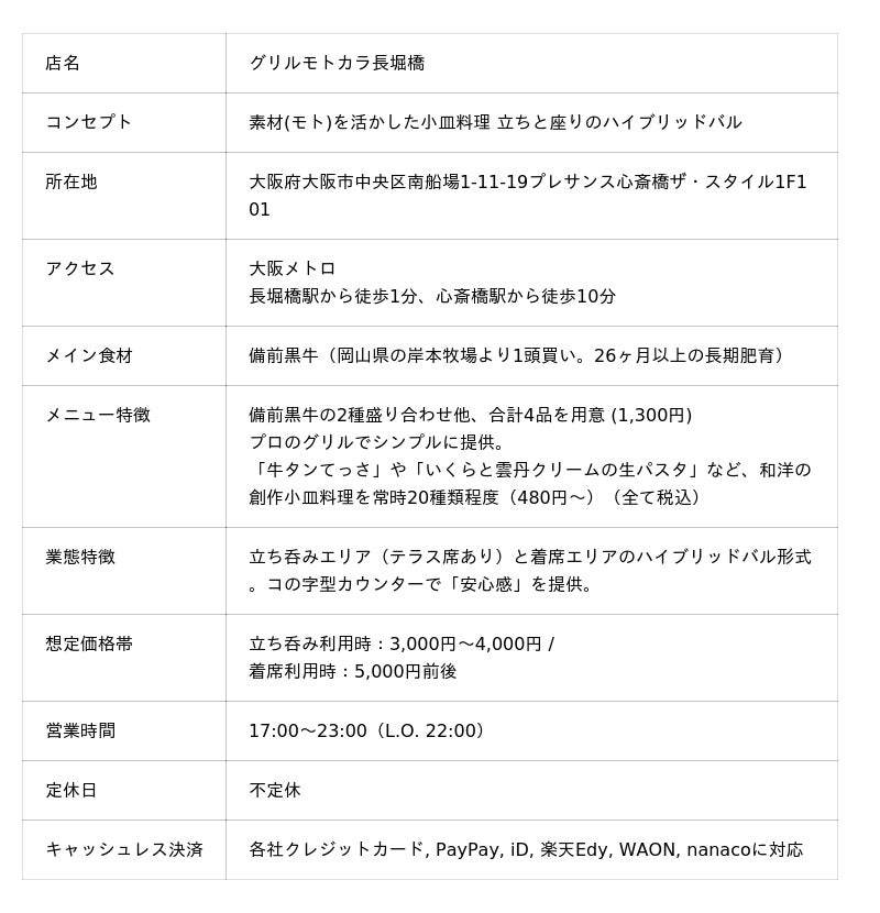 INSOUレストラン株式会社(本社:大阪府大阪市西区新町3-6-10、代表者:山田 朋宏)は、2025年11月20日(木)に、大阪西中島と堺筋本町に姉妹店を構える**[グリルモトカラ長堀橋]**をオープンいたします。本店舗は、「素材(モト)を活かした小皿料理 立ちと座りのハイブリッドバル」をコンセプトに、洋食・イタリアンバル市場に新たな選択肢を提供します。