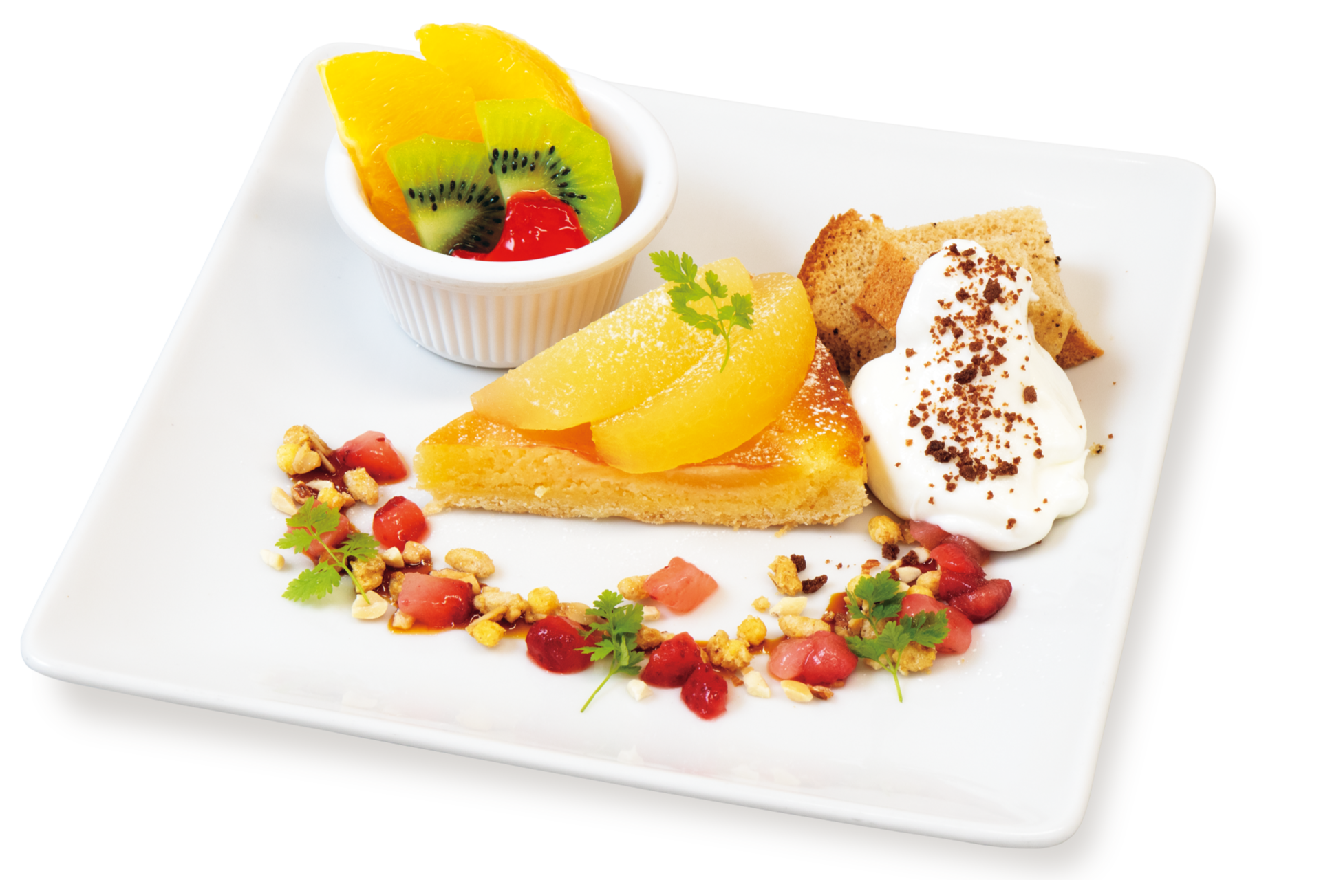 りんごのタルト盛り合わせりんごタルトと紅茶のシフォンケーキ、彩り鮮やかなフルーツを一皿で楽しめる盛り合わせプレート。