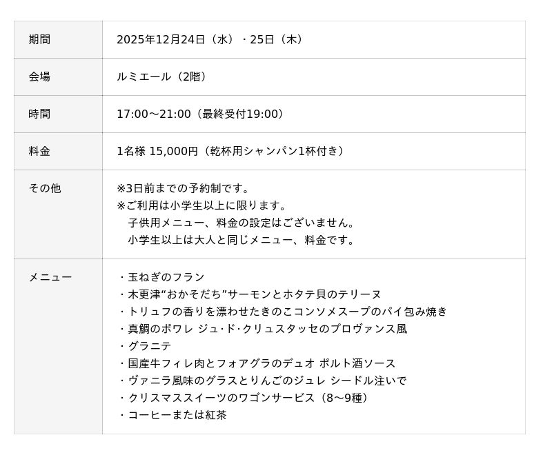 舞浜ビューホテル by HULIC(所在地:千葉県浦安市、総支配人:鈴木裕樹、運営:ヒューリックホテルマネジメント株式会社)は、2025年12月24日(水)・25日(木)の2日間限定で、あたたかな灯りが包む会場で楽しめる特別なクリスマスディナーコースを提供いたします。