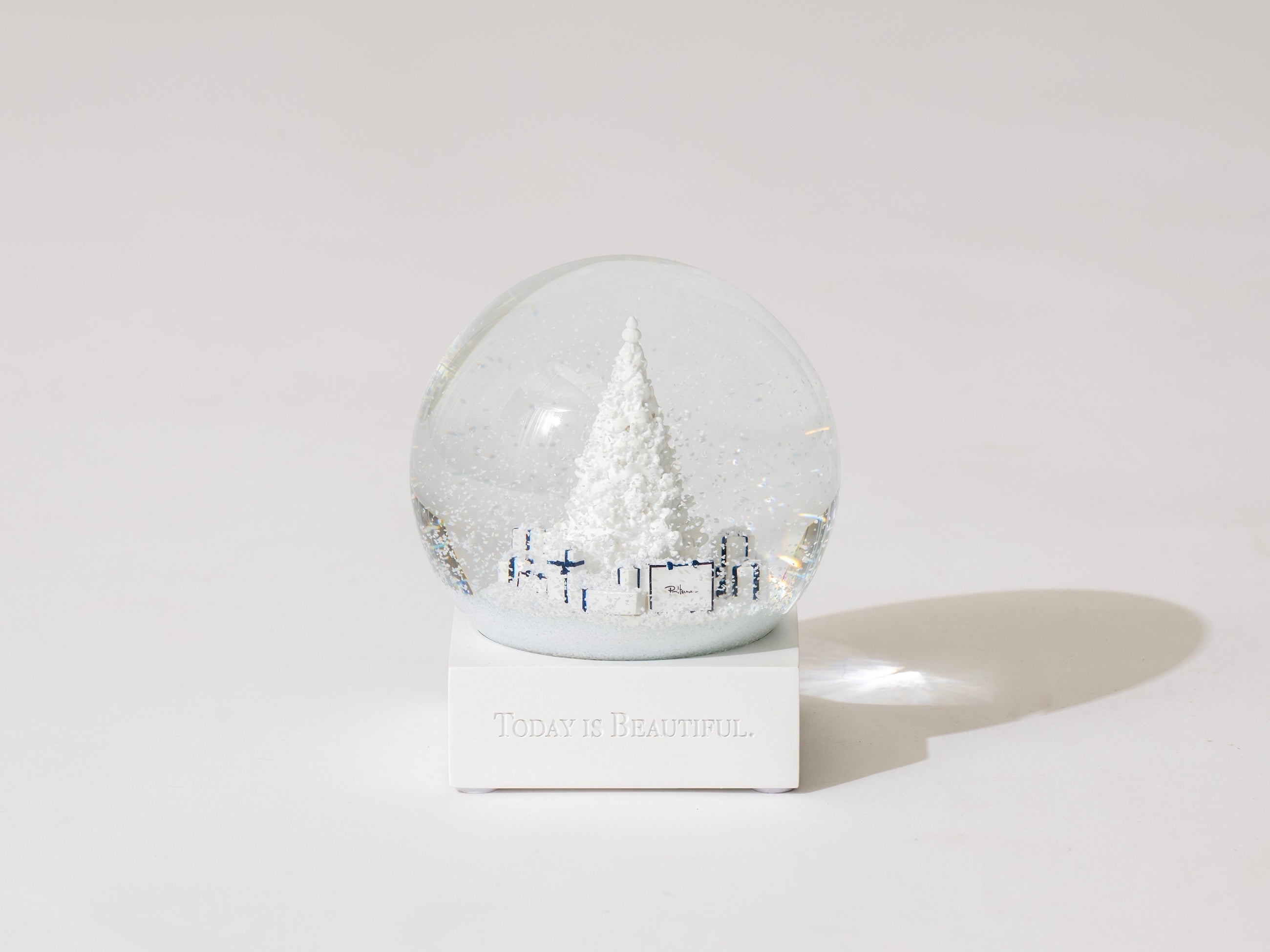 今年は、ロンハーマンのホリデーシーズンを象徴する大きなクリスマスツリーを中心に、ギフトボックスやショッピングバッグが並ぶ情景をデザインしたスノードームが登場します。ロンハーマンのブランドロゴとリボンにはネイビーを採用し、その他のモチーフはすべてホワイトで統一。洗練されたコントラストが、冬の静けさと温もりを感じさせます。