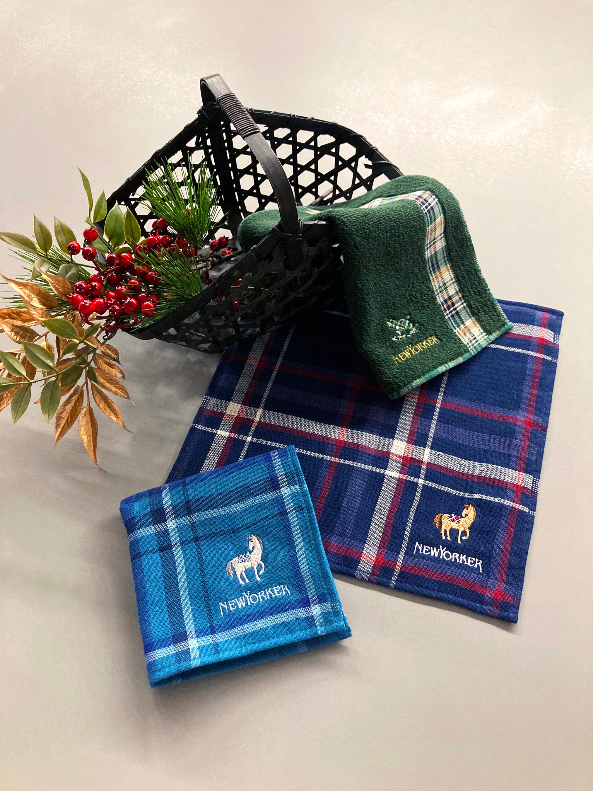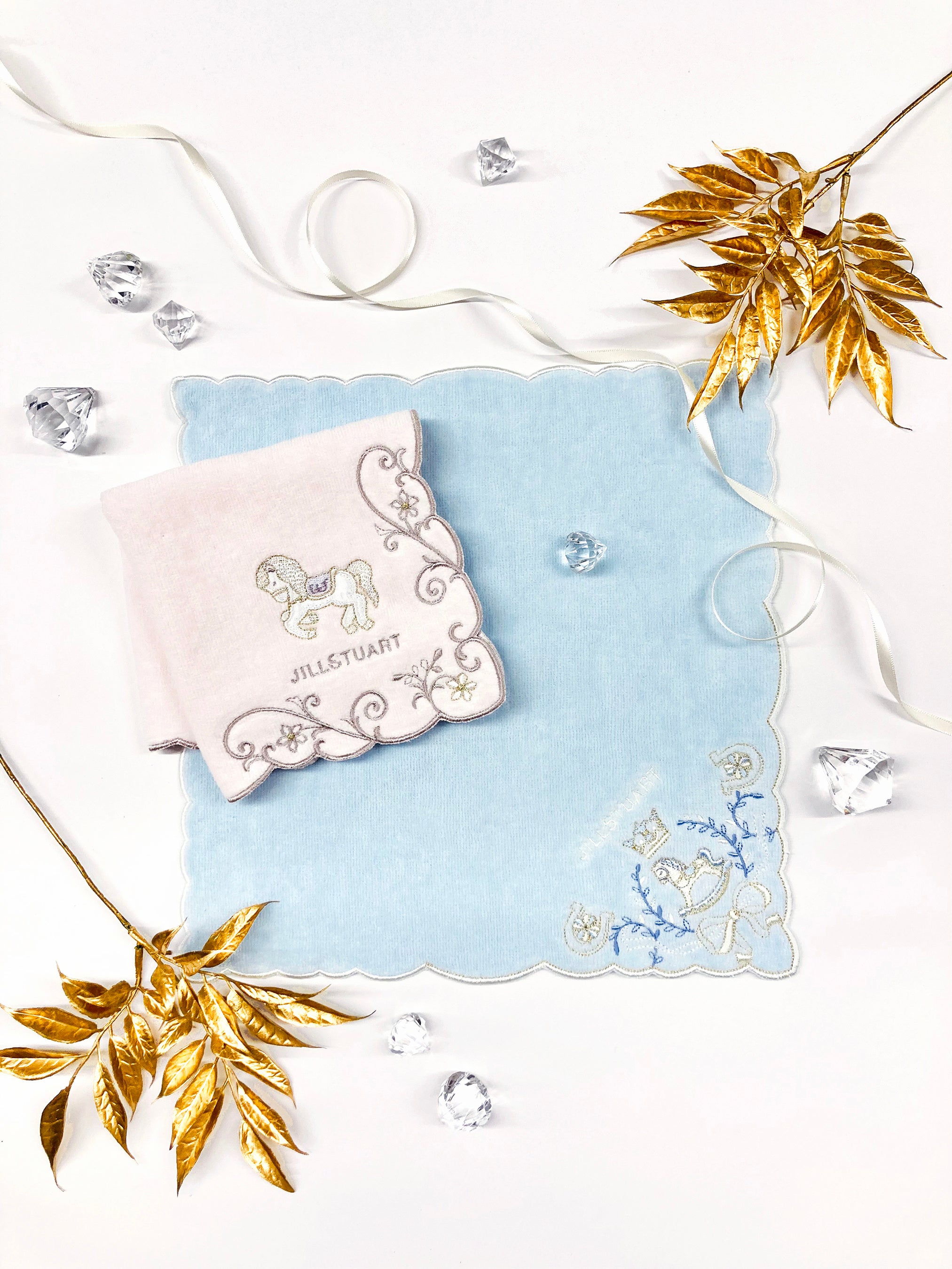 キラキラとした馬のアップリケ刺繍や、馬蹄・リボン・四つ葉のクローバーなどのラッキーモチーフが入った馬のデザインを取り入れた、新春にふさわしい華やかなタオルハンカチ。