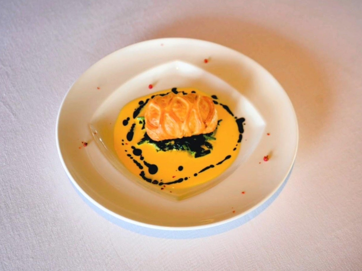 パイ包みは暖かい暖炉、サフランソースは炎、竹炭は暖炉の炭をイメージして仕立てた魚料理です。
