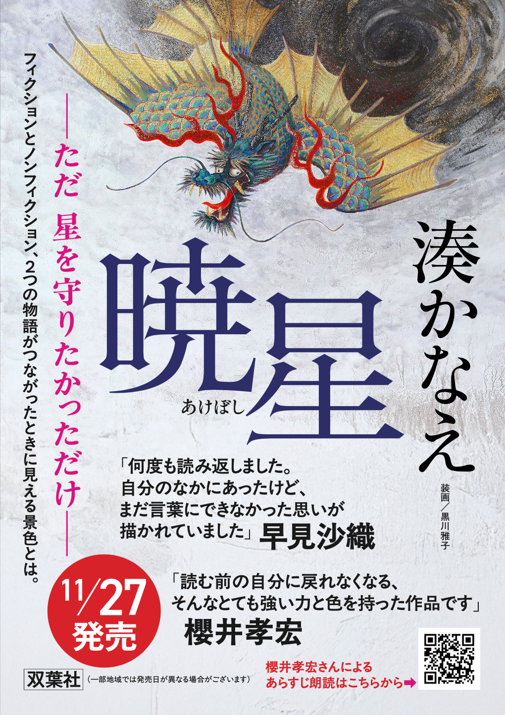 いよいよ来週27日に発売を控えた湊かなえさんの最新長編小説『暁星(あけぼし)』。「29作目にして一番好きだと断言できる作品です」と語る作家生活の集大成となる本作は、声優の櫻井孝宏さんと早見沙織さんによる豪華な朗読で話題となり、Audibleオーディオブックは売れ筋ランキングで1位を獲得(2025/11/19~)、kindleでは無料お試し版が冒頭から55ページを特別公開と、書籍の発売前から耳でも目でもその世界観を堪能できると注目されています。