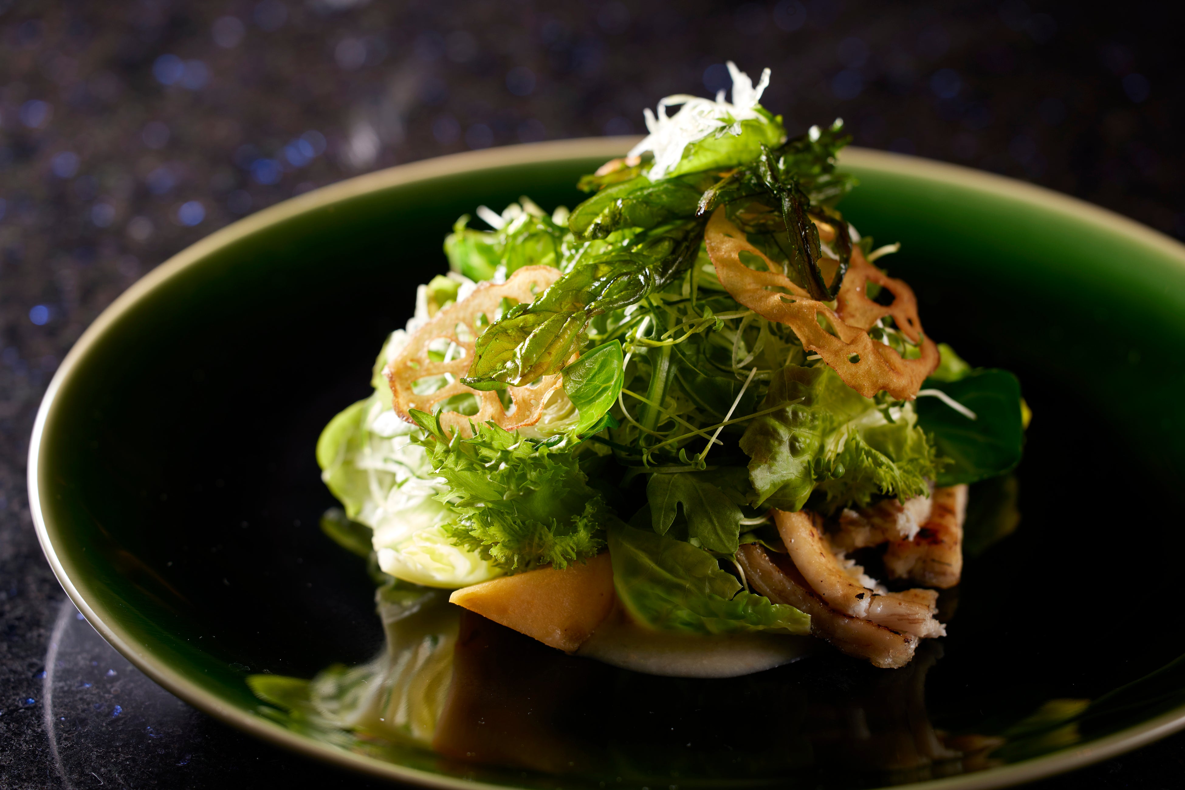 400年以上の歴史を誇る丁子屋のとろろ汁と、香ばしく焼き上げた国産鰻の白焼きをベースに、冬の大地が育んだ野菜を彩り豊かに盛り付けられたその姿はまるで、森をそのまま器に映したかのよう。特製の和風ドレッシングでさっくりと混ぜながら、自然の恵みと味わいの変化をお楽しみいただけます。まさに、 "森を食べるような" 贅沢なMORIZOサラダは、OMIKAコースとFUJIコースに登場いたします。