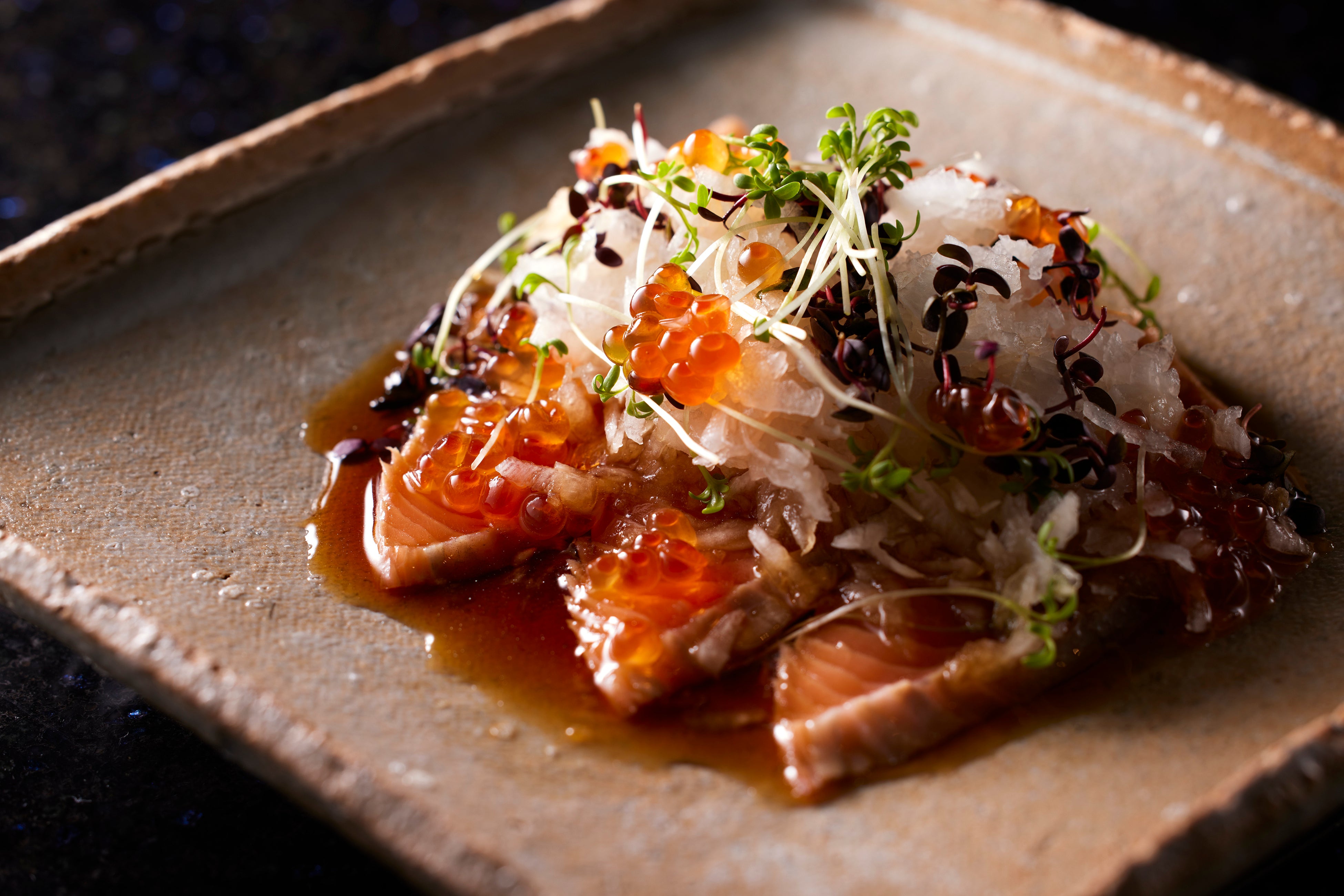 OYAMAコースとOMIKAコースでは、フジアトランティックサーモンの炙り刺身をご提供。たっぷりの鬼おろしといくらをトッピングし、さっと醤油ベースのタレをかけた国産アトランティックサーモンの深い旨味が、口の中でじんわりと広がります。