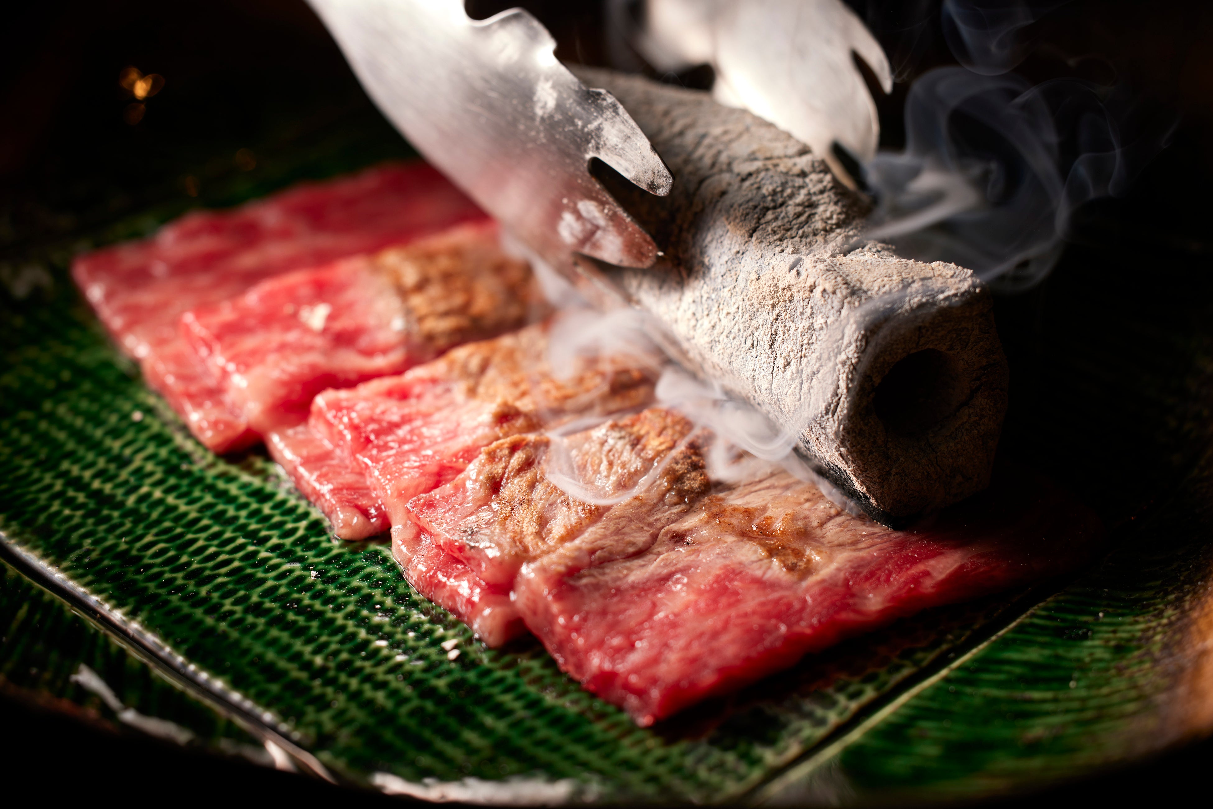 FUJIコースでは、冬の目玉料理として国産牛の焼きしゃぶしゃぶが登場。きめ細やかな国産牛を薄く敷き、目の前で炭を押し当てて炙ることで、ジュッという音とともに香ばしさが立ち上がります。薬味とともに巻いていただくことで、素材の旨味を最大限に引き出す一品です。