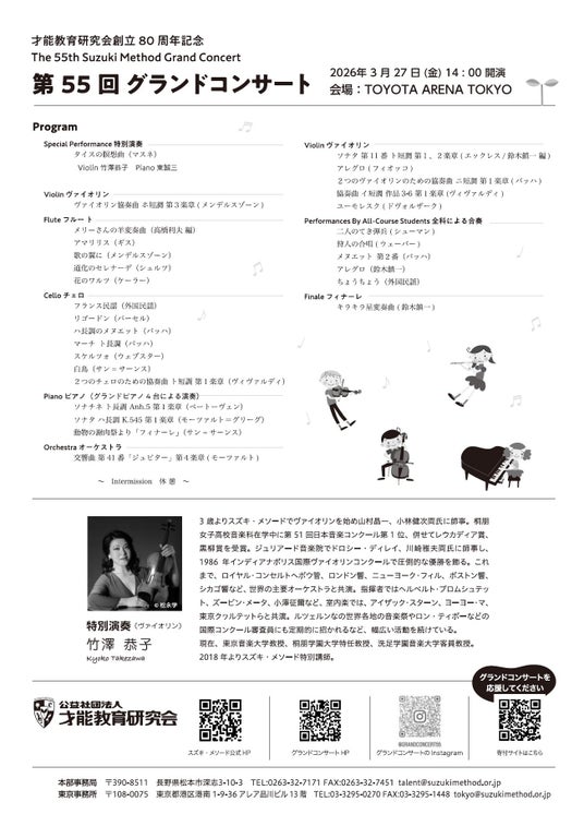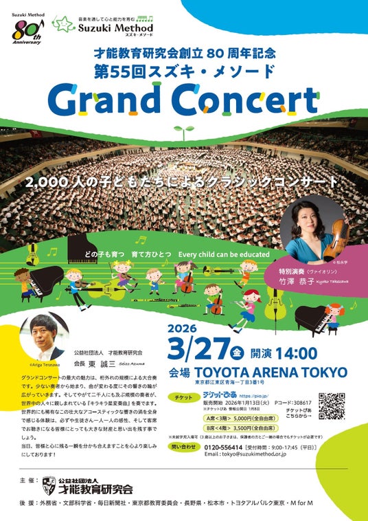 世界各国でスズキ・メソード音楽教室を展開する公益社団法人才能教育研究会(理事長:早野龍五、以下「スズキ・メソード」および「スズキ」)は、2026年に創立80周年を迎えます。