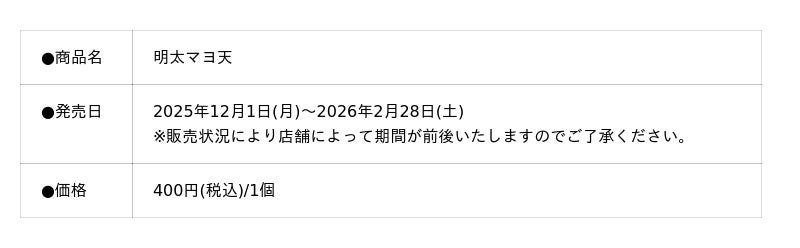 【磯揚げまる天】旬の味覚を楽しむ 冬限定の新商品「明太マヨ天」が登場!2025年12月1日(月)より一部店舗限定発売