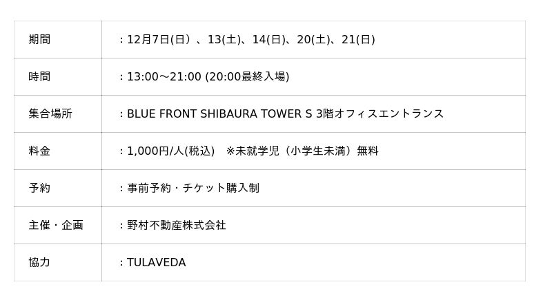 2025年12月6日(土)、7(日)、13(土)、14(日)、20(土)、21(日)各11:00~21:00