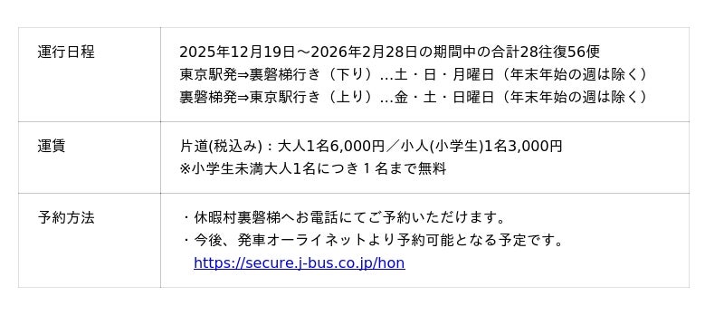 2025年12月~2026年2月の間、東京駅(バスターミナル東京八重洲)と裏磐梯主要ホテルを往復運行する高速バスです。