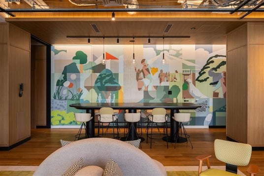 作品紹介:フィットネスジムの壁画(作品名「In Motion(イン・モーション)」)では、"動き"をテーマに細胞から経済の大きな流れまでを抽象的に描写した大型壁画。黒いラインはエネルギーや循環を表し、散らばる色や形が粒子のように広がり、金融街兜町から世界の市場へとつながるイメージを表現している。