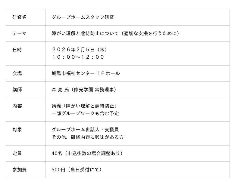 特定非営利活動法人ゆう・さぽーとは、城陽市障がい者自立支援協議会サービス調整部会の協力を受け、グループホームスタッフを対象とした研修会を2026年2月5日(木)に開催いたします。