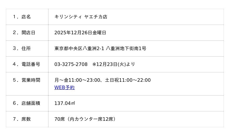 キリンシティ株式会社(本社:東京都中央区、代表取締役社長:波多野潤)は、2025年12月26日(金) 、東京・八重洲地下街の「キリンシティ ヤエチカ店」を全面リニューアルし、下記日程でリニューアルオープンいたします。