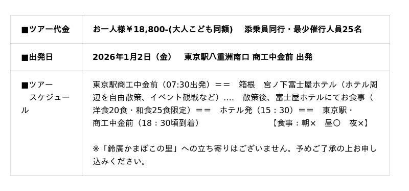 新年の幕開けを飾る熱いドラマが繰り広げられる箱根で、歴史ある名門ホテルの味と雰囲気を満喫できる贅沢な日帰りツアーにぜひご参加ください。