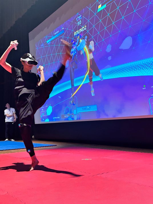 「VRテコンドー」は、ヘッドセットとモーションセンサーを用い、プレイヤーの全身動作を高精度でトラッキングして仮想空間に反映するeスポーツです。蹴り・パンチ・ステップワークなどあらゆる動作をアバターに再現し、1対1のリアルタイム対戦を行います。