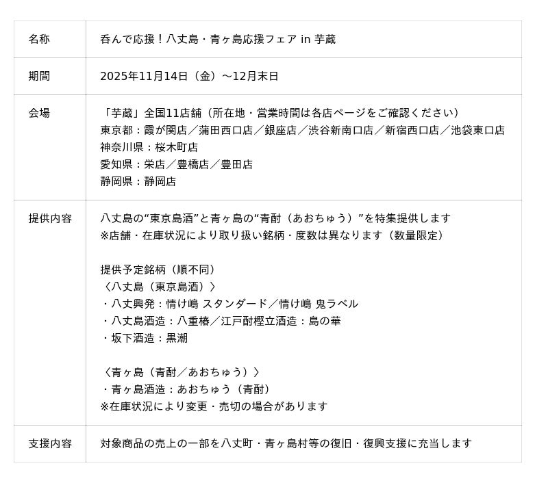 この状況を受け、株式会社マインドシェアは長年取り組んできた地域活性支援(島しょ産品支援を含む)の知見を生かし、株式会社ジェイグループホールディングスが展開する焼酎ダイニング「芋蔵」と連携。八丈島の"東京島酒"と青ヶ島の"青酎(あおちゅう)"を全国11店舗で一斉に特集提供し、