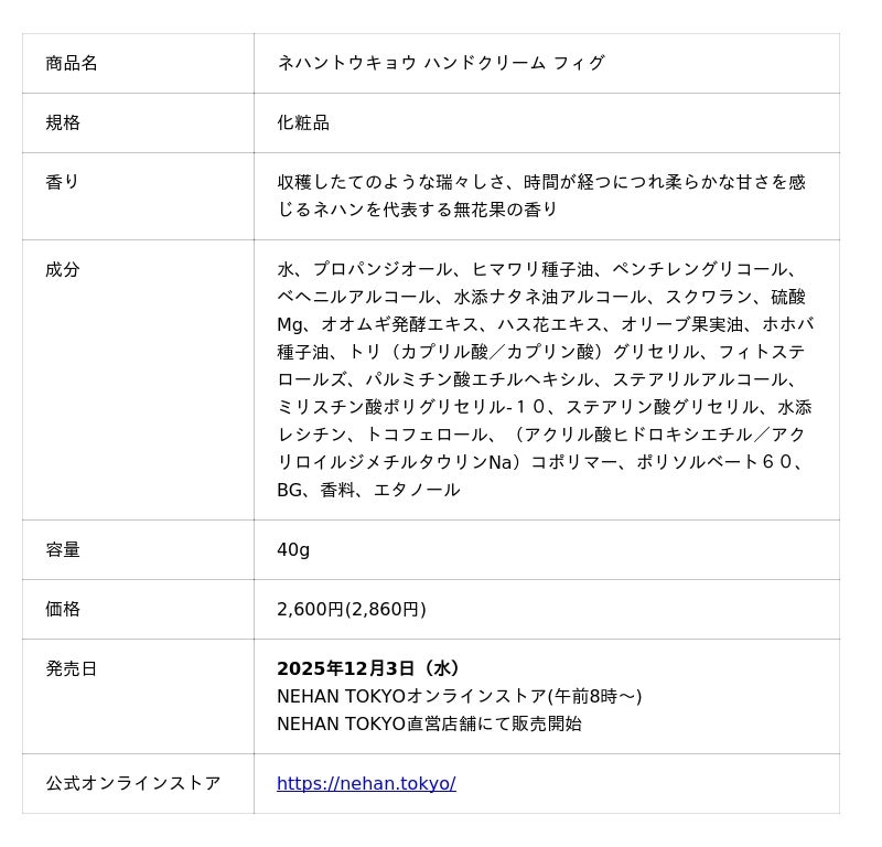 【2025年12月3日発売】この冬、みずみずしい無花果の香りをそっと手肌に。NEHAN TOKYOから新作ハンドクリーム登場。