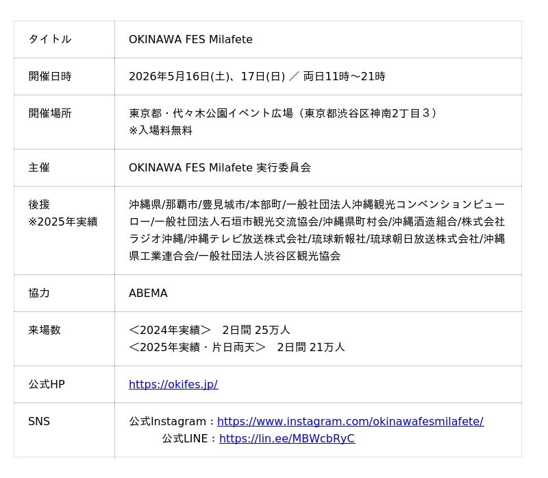 ミラフェート株式会社(所在地:沖縄県那覇市、代表取締役:笠井 誉文)は、沖縄の魅力を全国へ発信するイベント「OKINAWA FES Milafete(オキナワフェス ミラフェート)」を、2026年5月16日(土)・17日(日)の2日間、東京都・代々木公園イベント広場(渋谷区神南2-3)にて開催いたします。