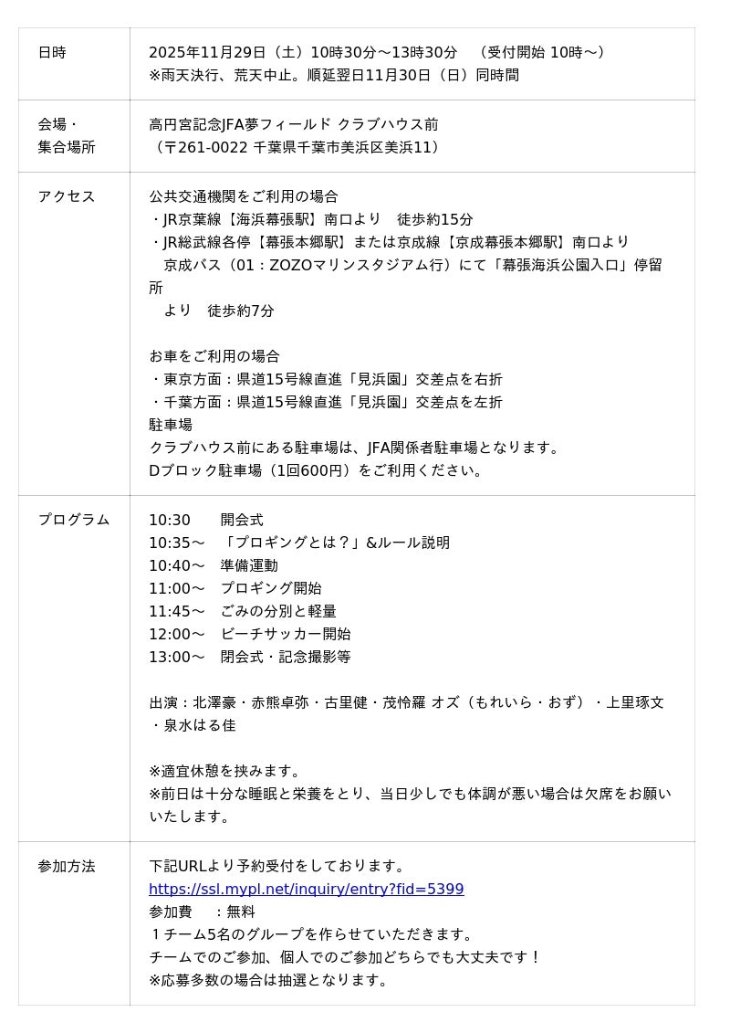 一般社団法人海と日本プロジェクトin千葉県(千葉県千葉市中央区、代表理事:麻生恵 以下、当団体)は、2025年11月29日(土)に、千葉県幕張にてプロギング×ビーチサッカーのイベント「PLOGGING MAKUHARI PLUS+ 2025」(以下、本イベント)の第4回イベントを開催いたします。本イベントは、日本財団が推進する海洋ごみ対策プロジェクト「海と日本プロジェクト・CHANGE FOR THE BLUE」の一環で開催するものです。