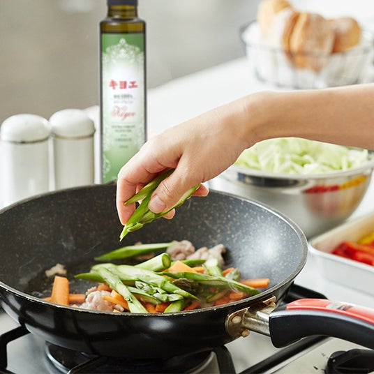 毎日の家庭料理に良質のオリーブオイル。癖の少ないオリーブオイルなので、そのまま醤油やポン酢と合わせやすい。