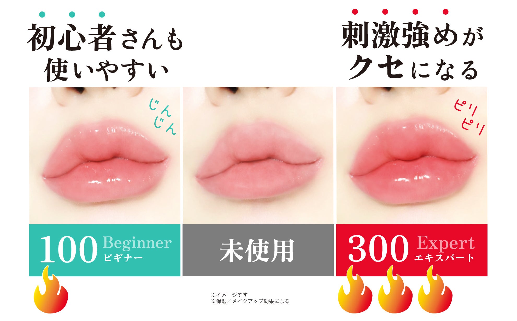 ピリピリとした温感刺激が、存在感のあるぷっくり唇を演出する上級者向けのプランパー「300 エキスパート」と、マイルドな使用感で自然なボリューム感を演出する初心者向けのプランパー「100 ビギナー」の2種類をご用意。シーンや気分、お好みにあわせてお選びいただけます。