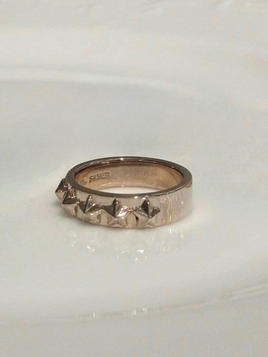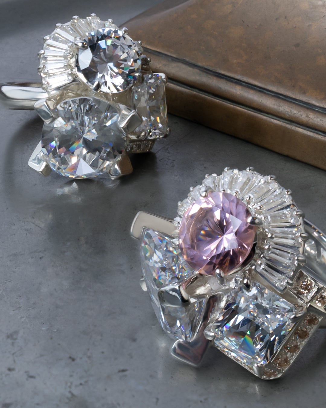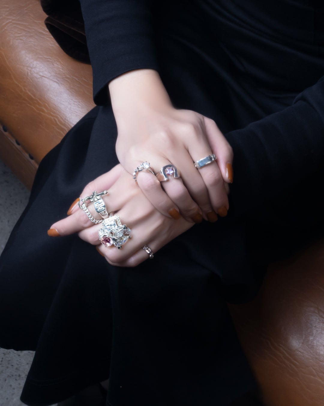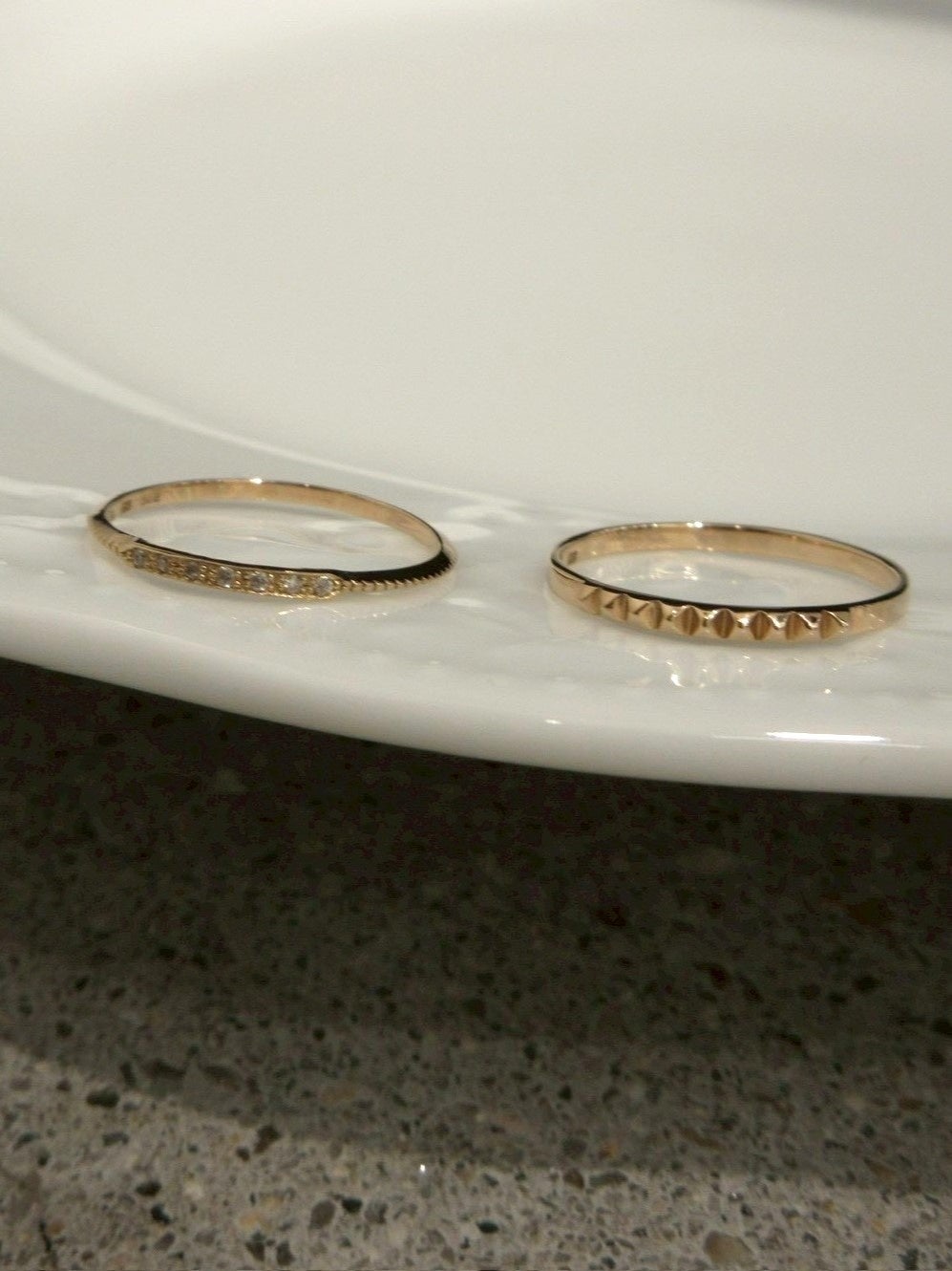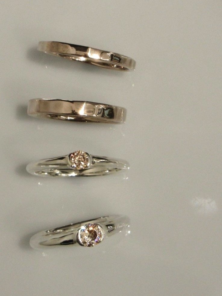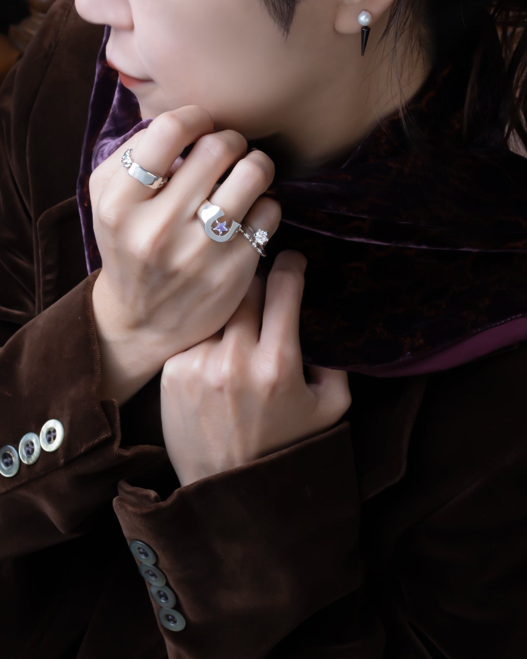 他にも通常のシルバーのアームに、シャンパンゴールドカラーのキュービックジルコニアをセッティングしたリングも。淡いサーモンピンクは甘くなりすぎない絶妙なニュアンスカラーです。