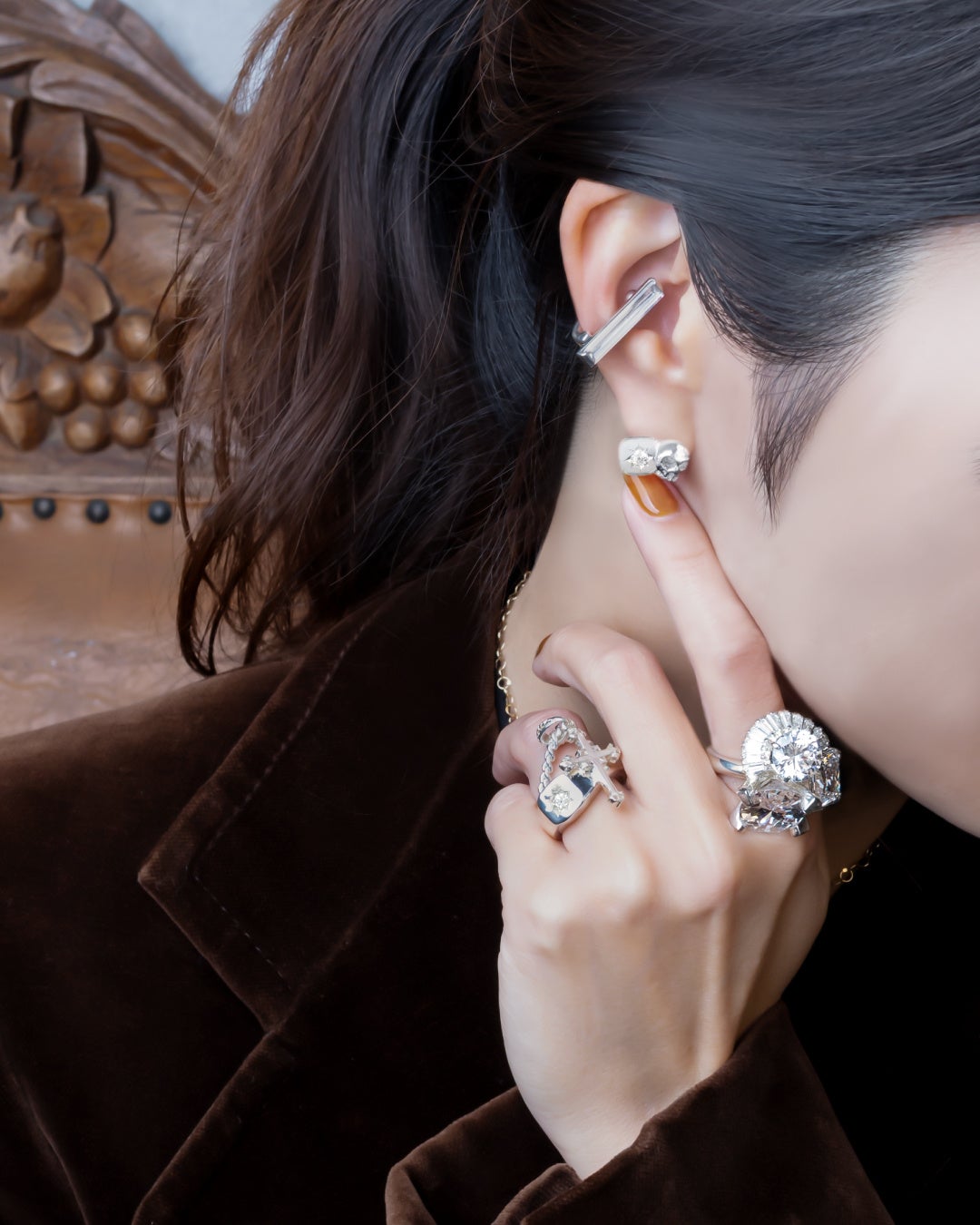 耳元 スカルモチーフピアス¥31,900、イヤーカフ(定番アイテム)¥36,300、人差し指リング¥129,800、薬指リング¥86,900 ※イヤージュエリーはすべてシングル ※すべて税込
