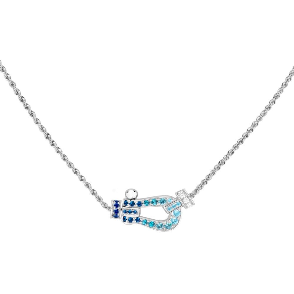 ホワイトゴールドのチェーンには、美しいブルーのグラデーションを放つカラーストーンが配され、その輝きはまさに海に降り注ぐ太陽の光のようです。