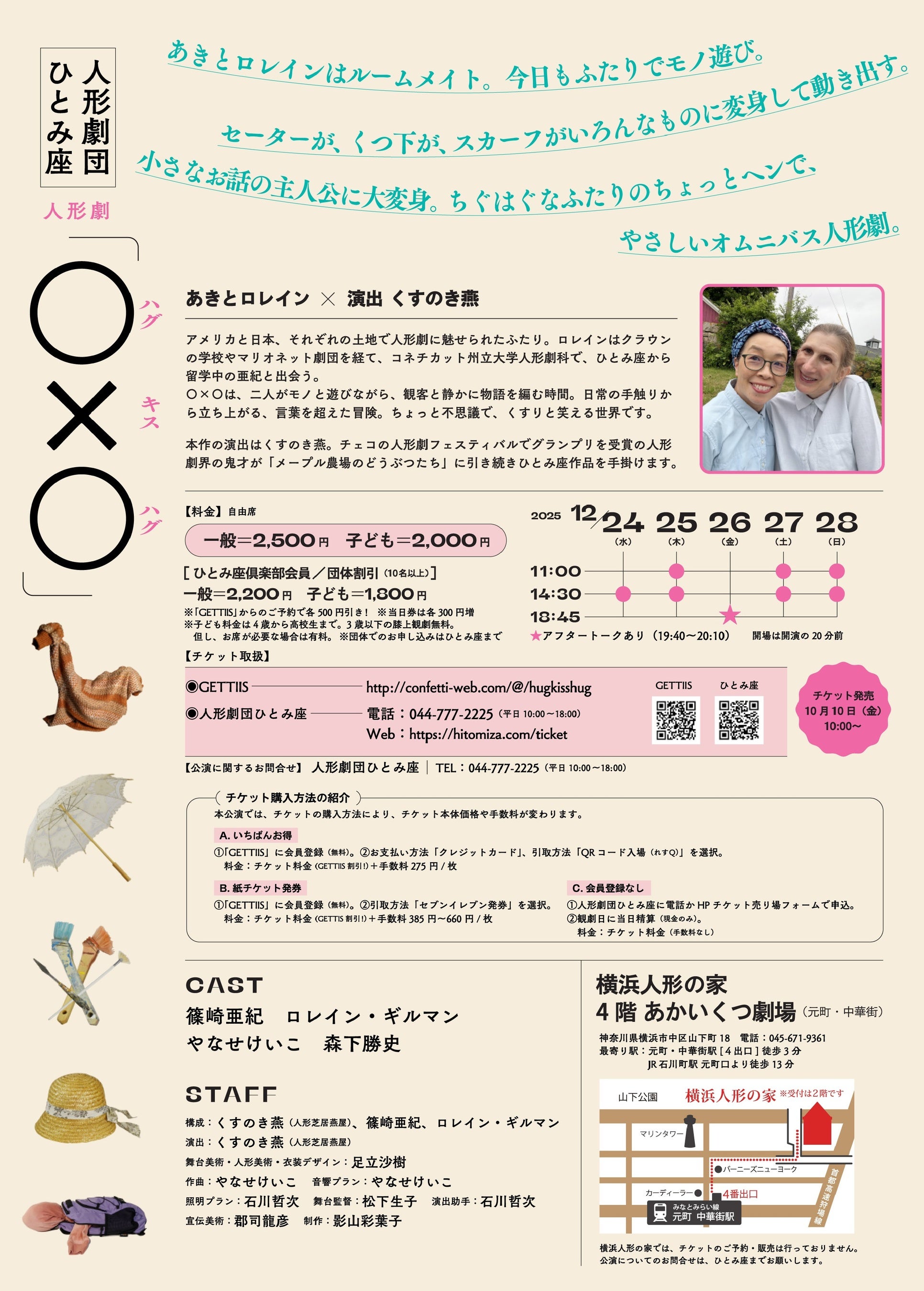 「〇×〇(ハグ キス ハグ)」は、ちぐはぐなふたりのちょっとヘンで、やさしいオムニバス人形劇です。日常の手触りから立ち上がる、言葉を超えた冒険。ちょっと不思議で、くすりと笑える世界--。クリスマスから年の瀬のあわただしい時期に、ぜひ静かに物語を編む時間をお楽しみください。