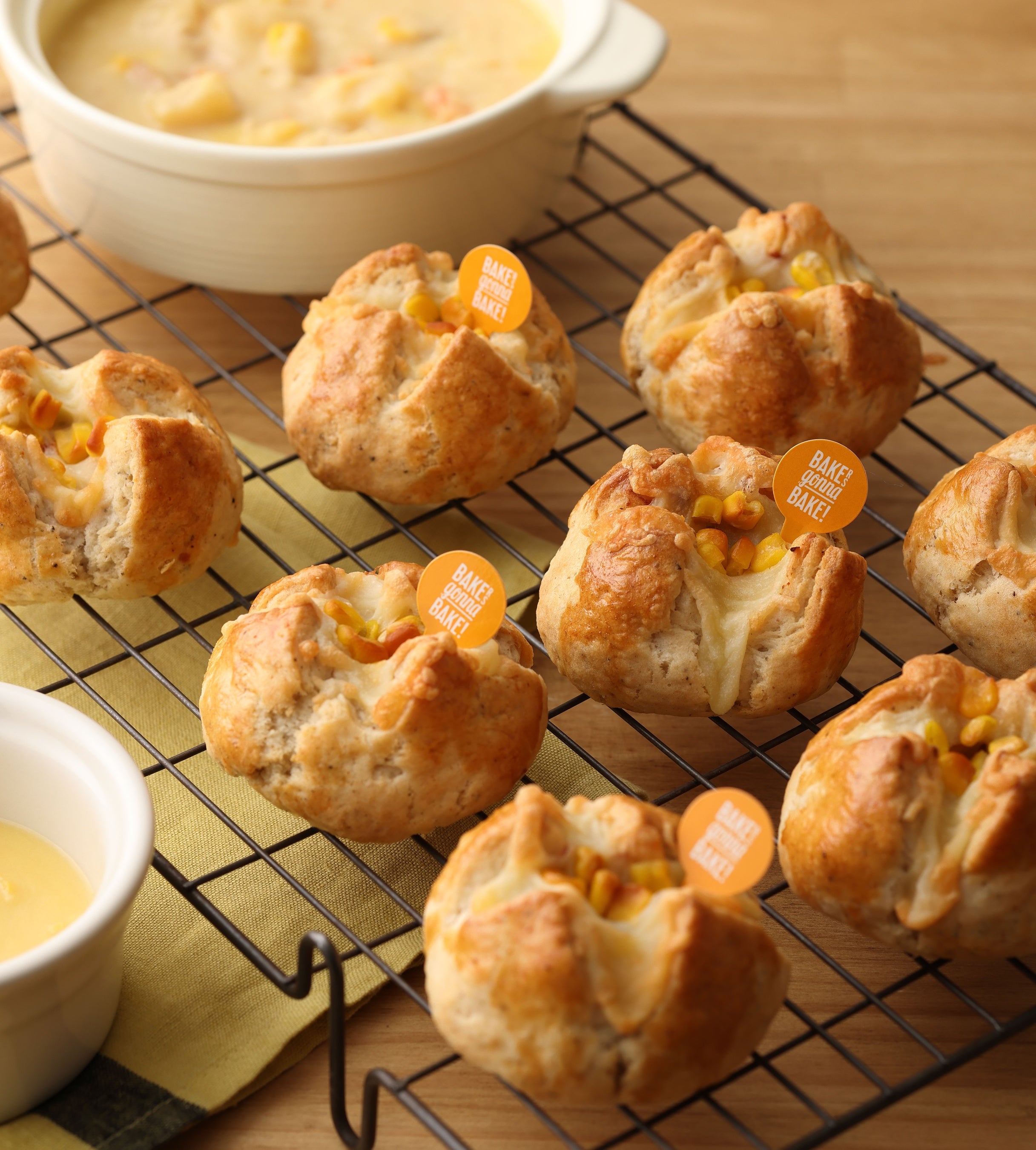 北海道産の生クリームから作ったコーンクリームに、ベーコンやじゃがいも、にんじんをあわせ、スパイスを効かせたスコーンで包みました。具材感たっぷり。温めてさらに美味しい!