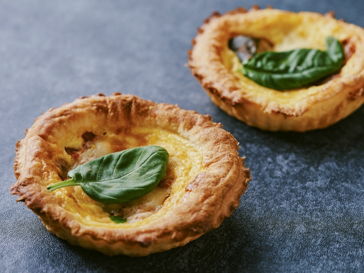 クロワッサン生地のキッシュにラタトゥイユとグリルチキンをトッピング。バジルがアクセントです。