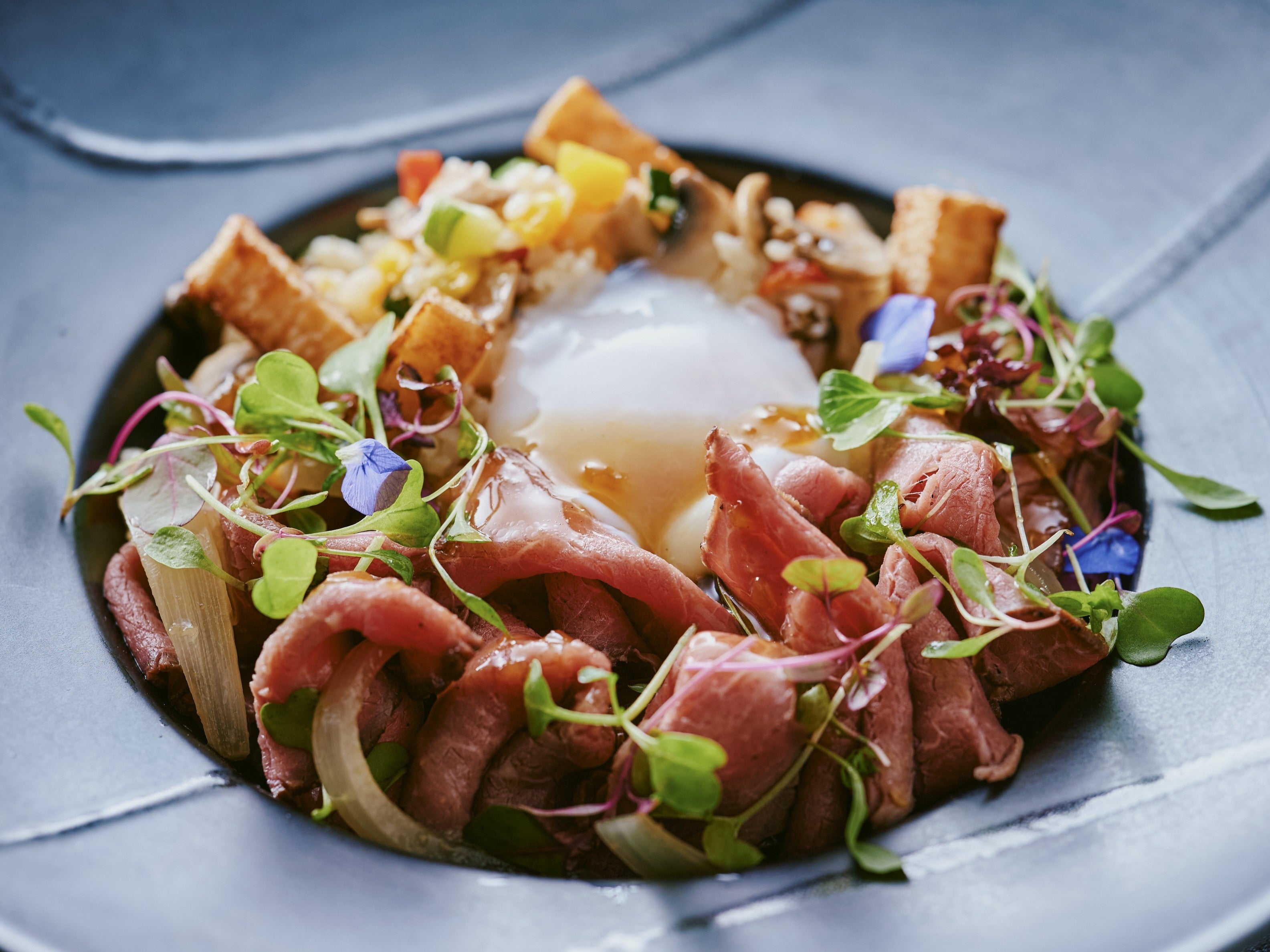 野菜のピラフにローストビーフと温度卵を乗せて、相性の良いトリュフ風味のソースでリッチな味わいです。