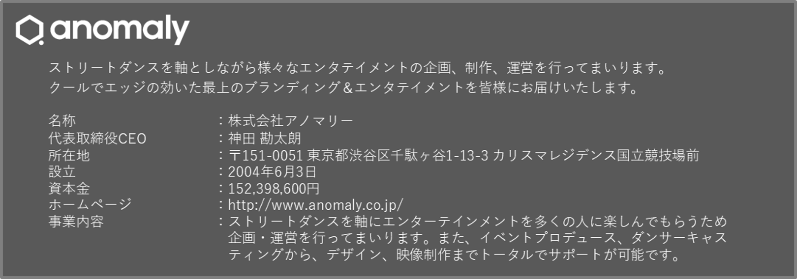 クリエイション:RYUJY(V-RAZE)男らしさ全開のHIPHOPチーム、V-RAZEに所属し、手足の長さ、ガタイの大きさ、音に繊細なアプローチをかけ、感情溢れ出る灼熱のエナジーさは誰にも真似できない唯一無二のスタイル。