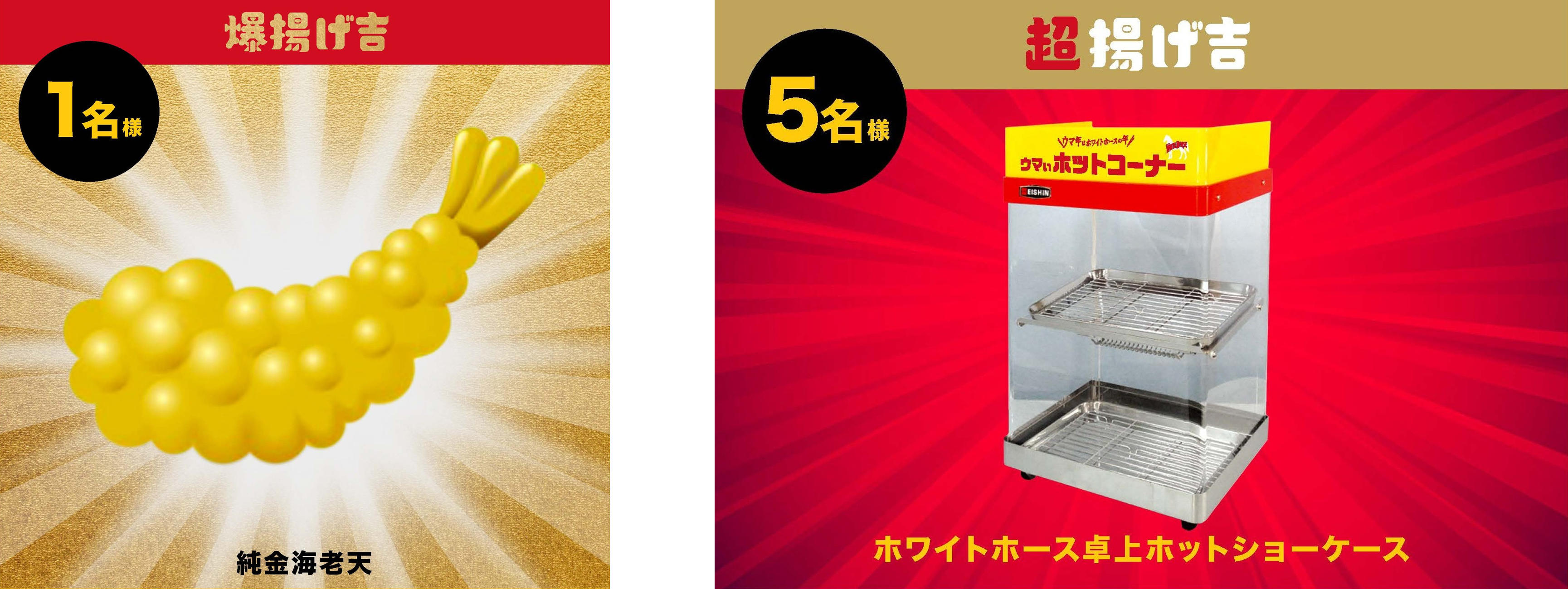 2026年1月5日(月)から始まる第2弾では、「ホワイトホース」ブランドオリジナルの「揚げみくじ」キャンペーンを実施します。「揚げみくじ」をひいて当たりが出ると、ラグジュアリーな「純金海老天」やコンビニのホットスナックコーナーを自宅で再現できる「ホワイトホース卓上ホットショーケース」など、遊び心と贅沢さを兼ね備えた"アガる"豪華景品をプレゼントします。2026年にちなみ、総勢2,026名様に賞品が当たる特別な企画です。