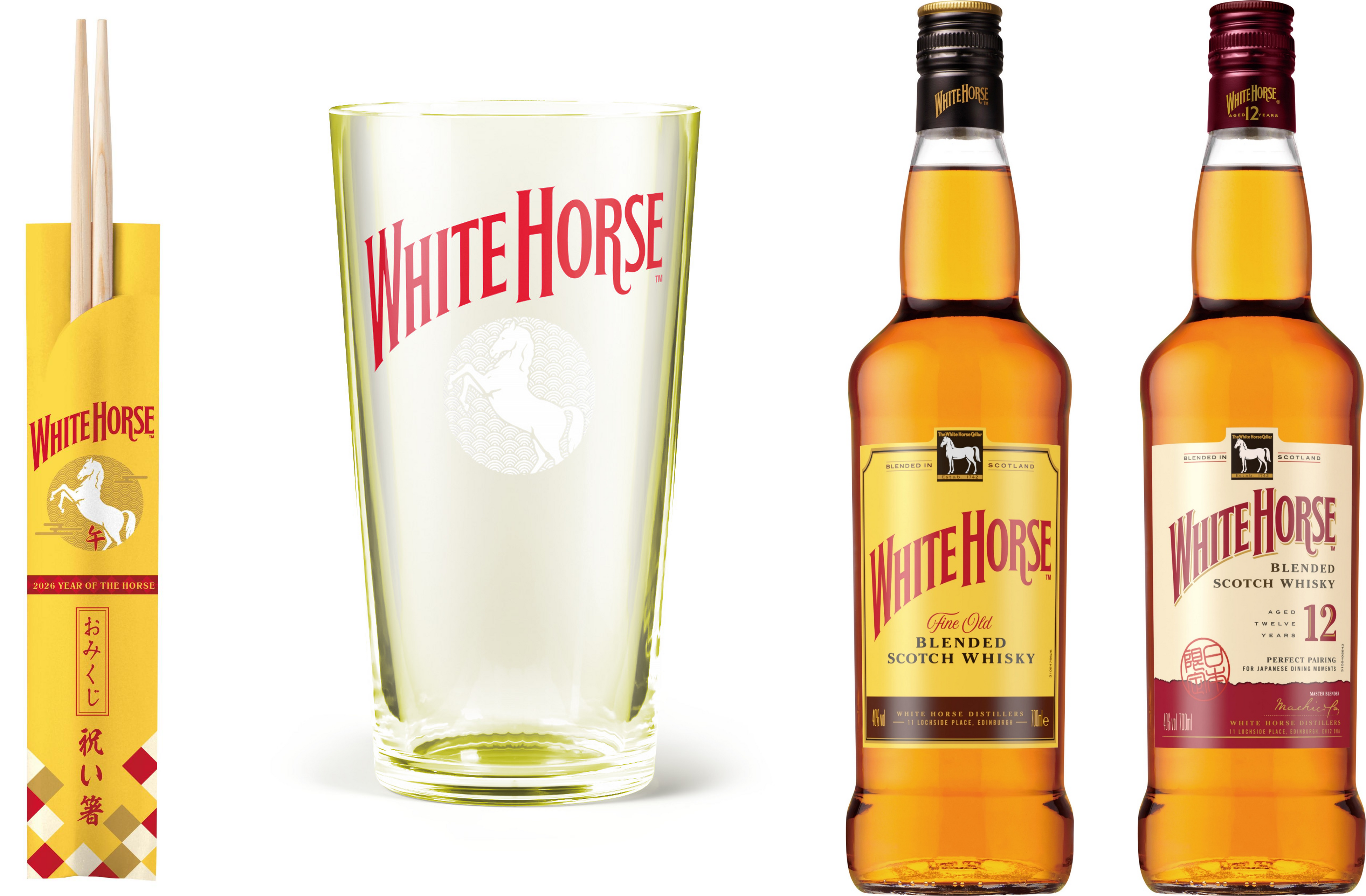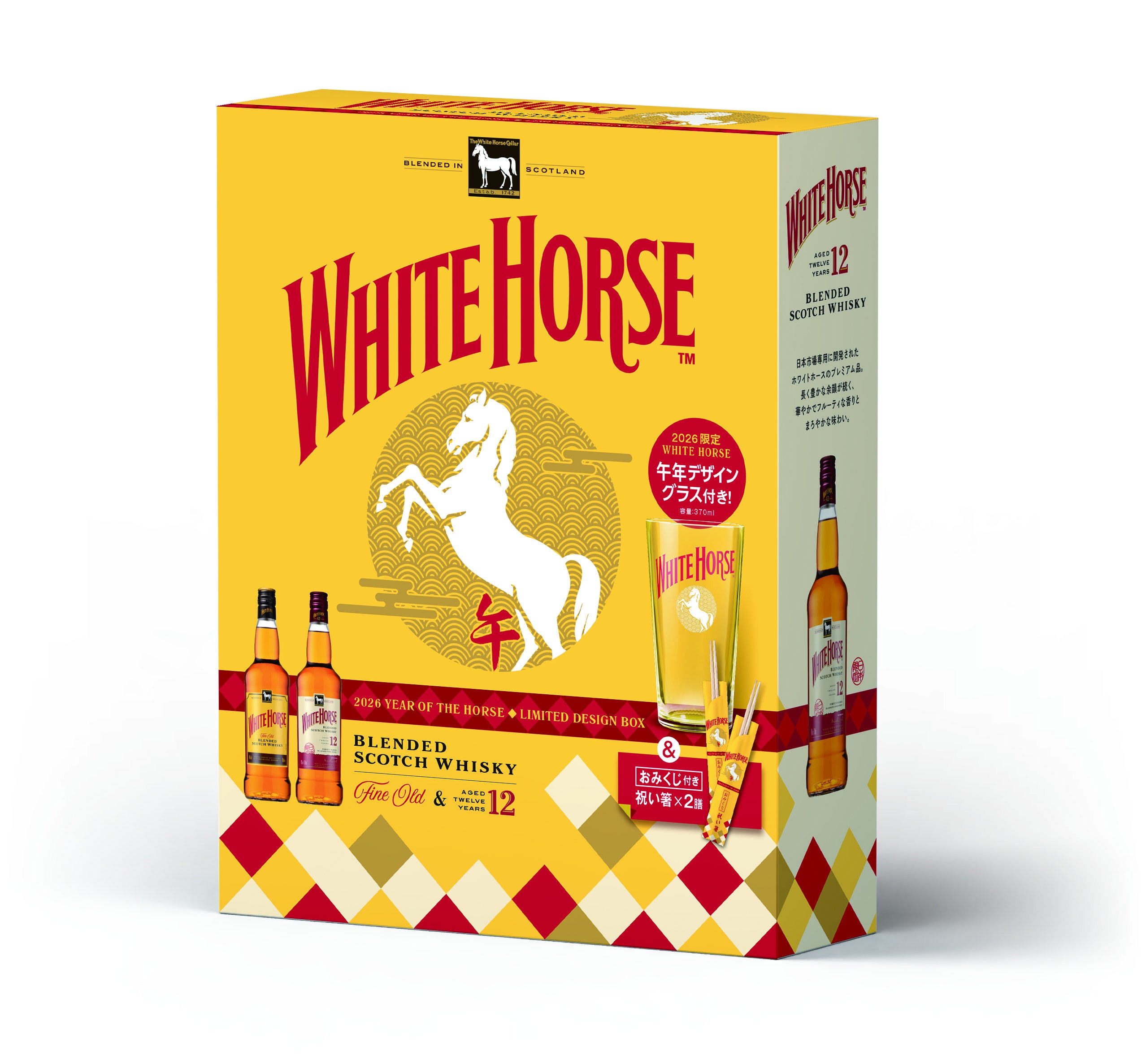 「ホワイトホース ファインオールド」、「ホワイトホース 12年」各1本、オリジナル干支グラスとおみくじ付祝箸がセットになった「ウマ年限定BOX」をプレゼントします。