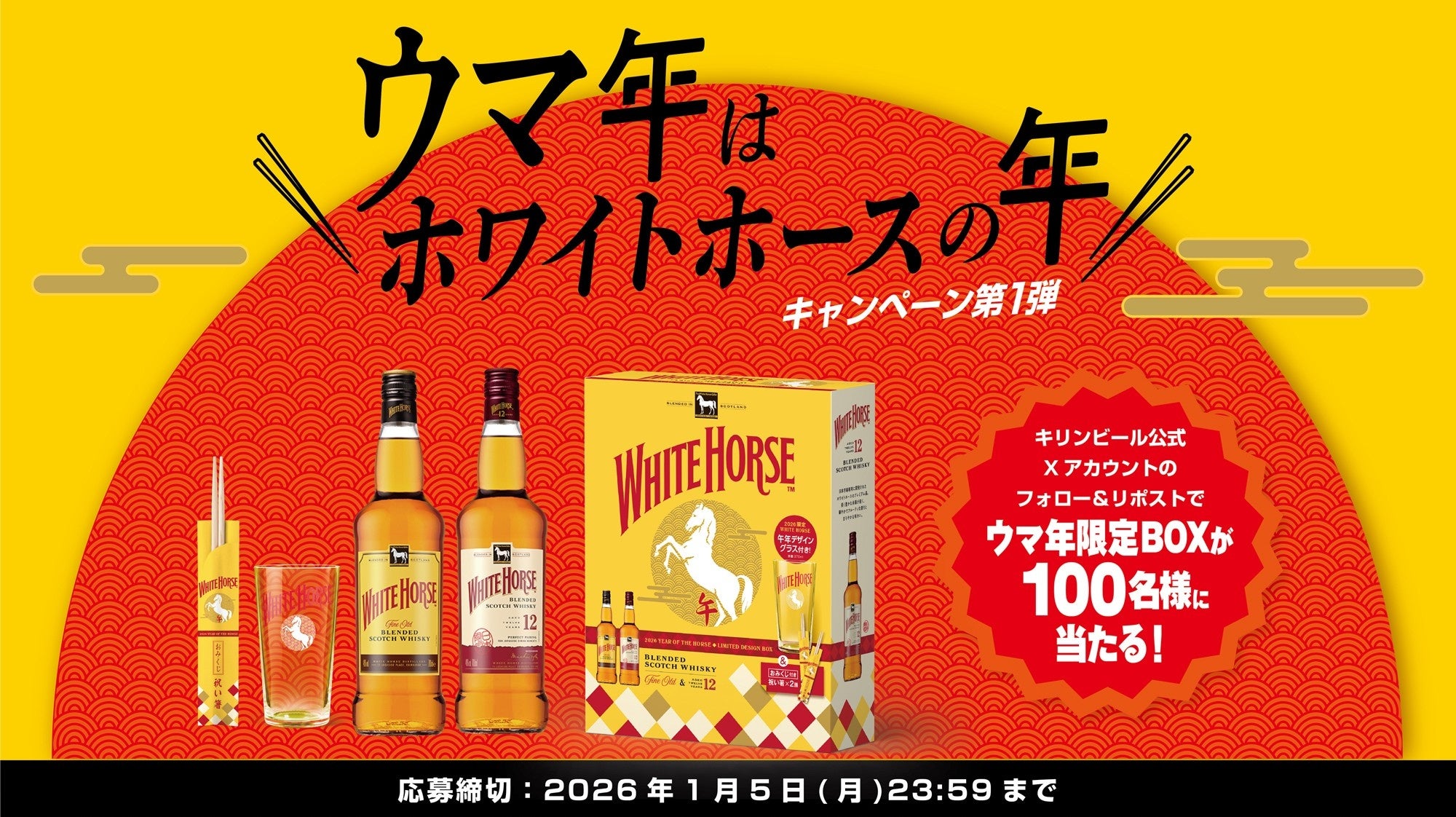 限定BOXが当たるXフォロー&リポストキャンペーンと2026名様に"アガる"景品が当たる「揚げみくじ」企画、さらにウマ年TVCM放送で、「ホワイトホース」ブランドが年末年始を盛り上げる