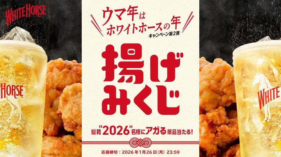ブランド名に「ホース(=馬)」を掲げる「ホワイトホース」にとって、2026年のウマ年は特別な年です。オリジナルグラス付き「ウマ年限定BOX」があたるXのフォロー&リポストキャンペーンや、"アガる"豪華景品が当たる「揚げみくじ」キャンペーンを通じて、年末年始に家族や仲間と過ごす楽しいひとときをお届けします。
