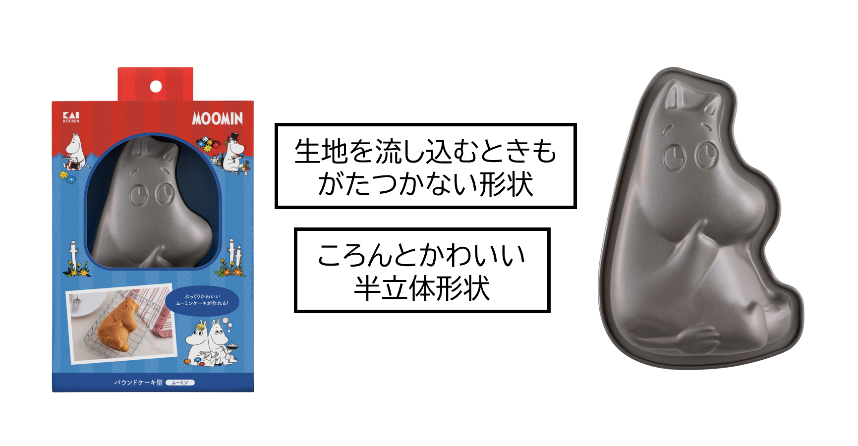 ぷっくりとしたムーミン型のかわいいパウンドケーキが焼ける金属型。目や耳部分の模様は凹形状に焼き上がるので、チョコペンなどでのデコレーションも簡単。