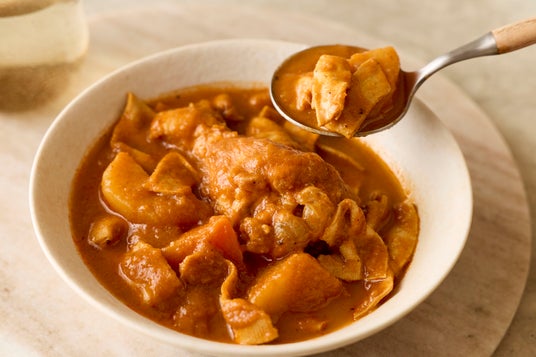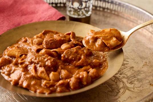 トマトの風味が食欲をそそるインド風の本格マサラカレーに、柔らかく煮込んだ豚肉とひよこ豆がゴロゴロ。