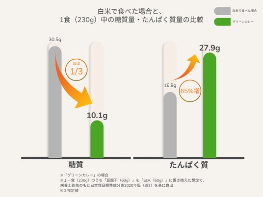 白米で食べた場合と、1食(230g)中の糖質量・たんぱく質量の比較