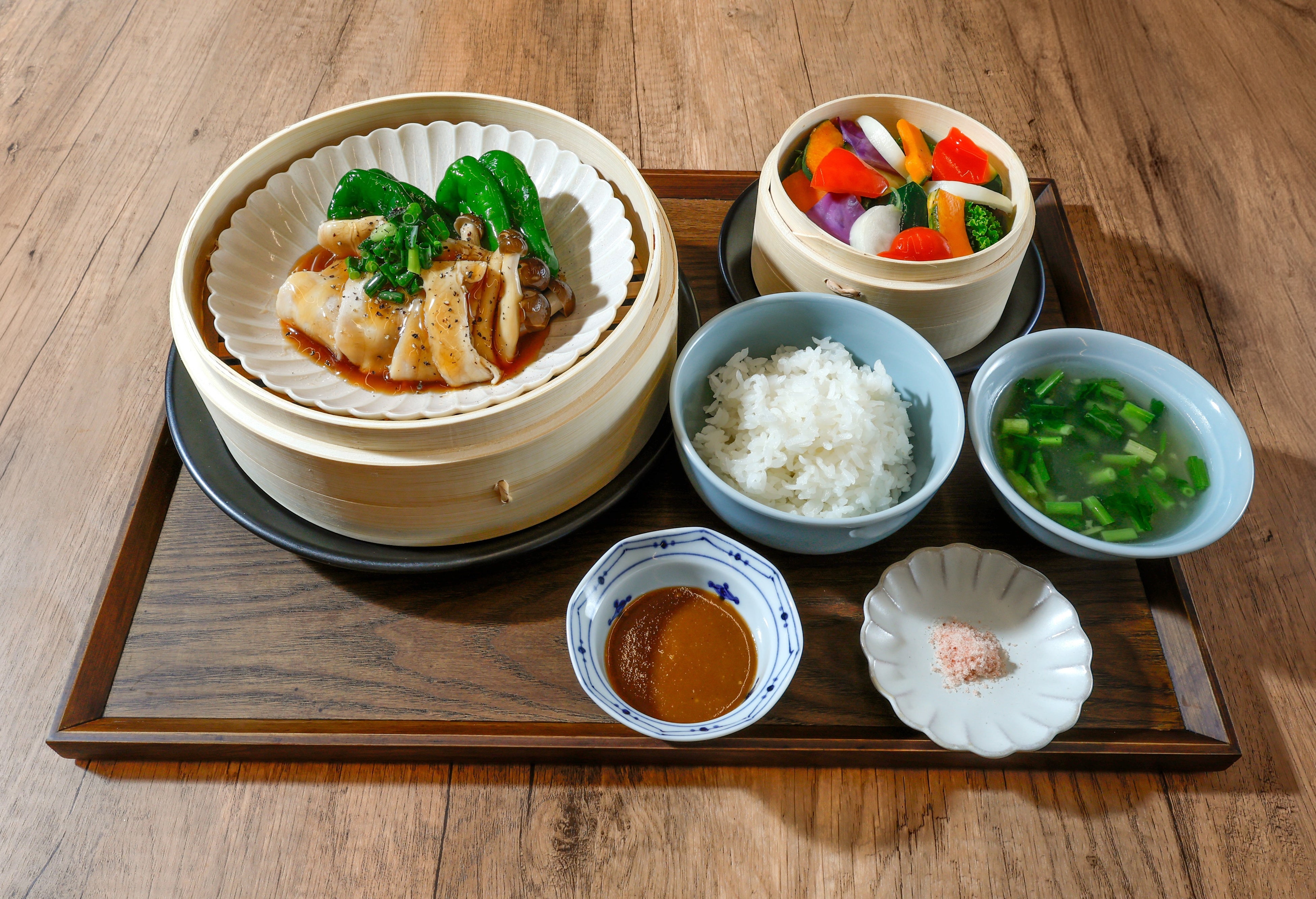 せいろでごはんの定食一品料理にご飯、スープ、蒸し野菜がついたバランスの良い体にやさしい定食です。あつあつのお料理を、せいろにのったままお客様の元へお届けいたします。
