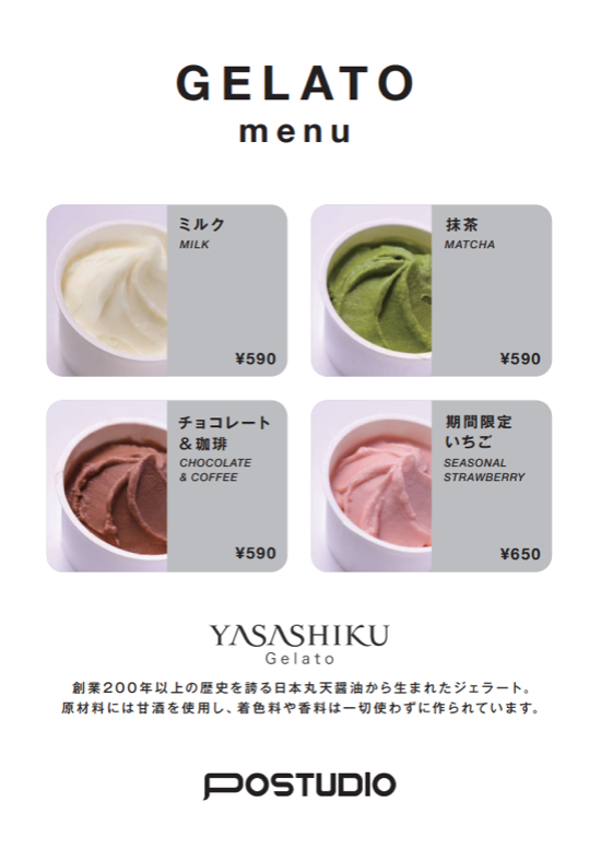 創業200年以上の歴史を誇る老舗醤油会社。9月上旬に新しくオープンしたNEWoMan高輪内の「POSTUDIO(ポスタジオ)」にてYASASHIKU Gelatoの販売を開始
