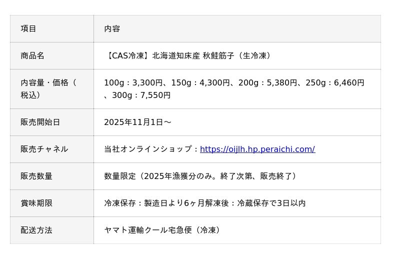 北海道の旬の魚介を、生に近い状態で食卓にお届けしたい。その想いから始まった新プロジェクトの第一弾です。医療分野で実績のあるCAS冷凍技術を水産加工に応用することで、これまで産地でしか味わえなかった『生』の筋子を全国のお客様にお届けできるようになりました。2025年は記録的な不漁で筋子の確保は困難を極めましたが、それでも『この味を届けたい』という想いで数量限定での販売を決定いたしました。ご家庭で筋子からいくらを作る体験は、お子様の食育にも最適です。知床の海が育んだ極上の筋子を、ぜひ『生』の状態でご堪能ください。■会社概要
