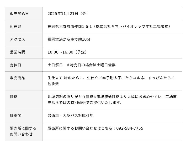 株式会社ヤマトバイオレッツ(本社:福岡県大野城市/ふくやグループ/代表取締役:梁川 剛一、以下 当社)は、製造全工程において一切冷凍処理を行わない「生仕立て 辛子明太子」を販売する直売店舗「博多めんたいアウトレット」を、2025年11月21日(金)に本社工場隣接地(福岡県大野城市仲畑1-6-1)にオープンいたしました。