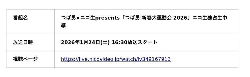 2026年1月24日(土) つば男×ニコ生 presents 「つば男 新春大運動会 2026」