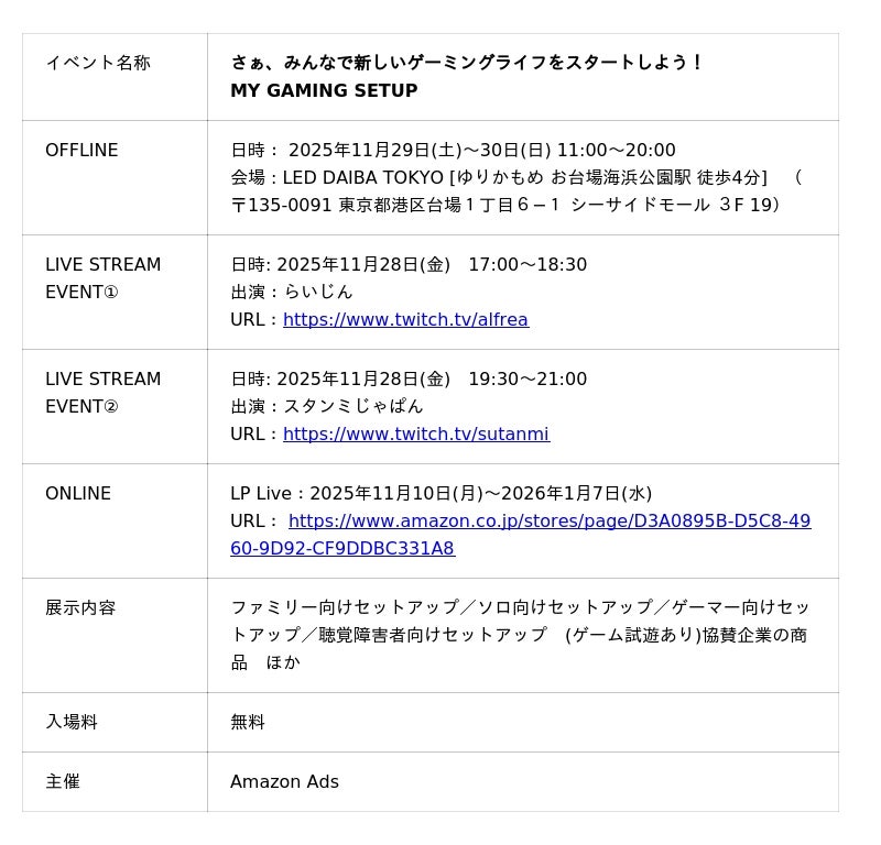 2025年11月29日(土)~30日(日)、Amazon Ads主催のゲーミングセットアップ試遊イベント「MY GAMING SETUP」(会場:LED DAIBA TOKYO)が開催されます。