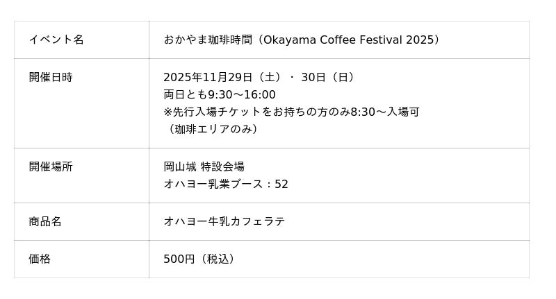 オハヨー乳業株式会社(本社:岡山県岡山市、代表取締役社長:藤本篤)は、2025年11月29日・30日に岡山城で開催される「おかやま珈琲時間(Okayama Coffee Festival 2025)」に協賛出店し、当社の「オハヨー牛乳」を使用したホットカフェラテを提供いたします。