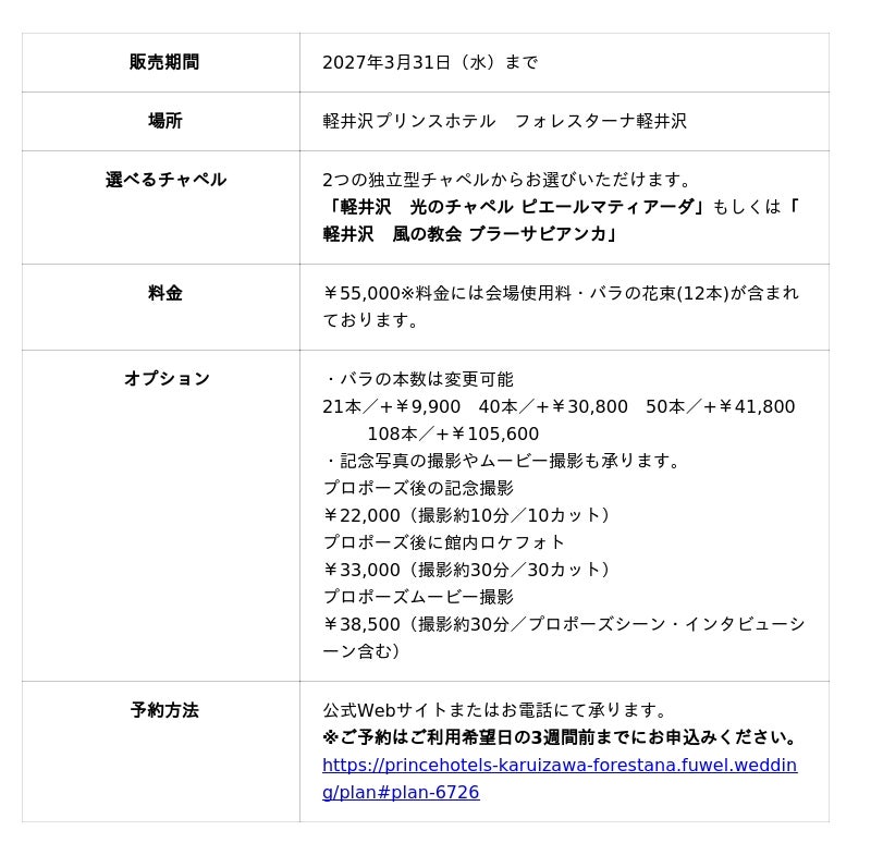 軽井沢プリンスホテル(所在地:長野県北佐久郡軽井沢町 総支配人:影山裕子)の結婚式場「フォレスターナ軽井沢」では、恋人へ記憶に残るロマンチックなプロポーズをしたいと考えるお客さまに向けて、独立型チャペルを貸し切りにしてプロポーズできる特別プランを販売しております。