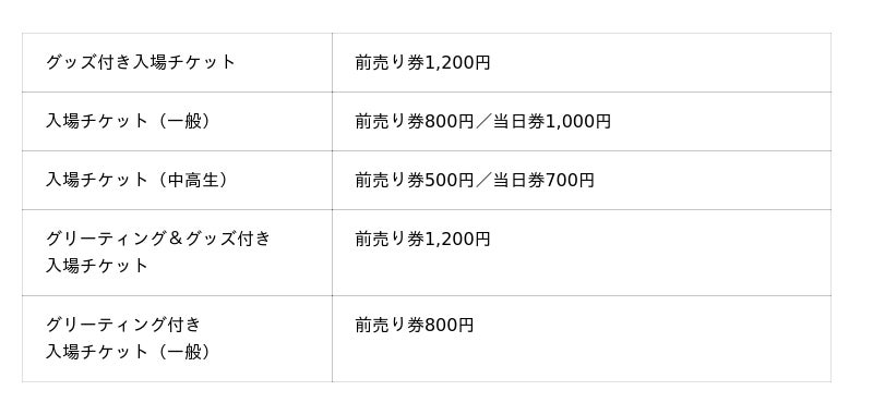 11月29日より、東京会場のグリーティング参加券付き入場チケットを先着にて販売いたします。また、愛知会場の入場チケット・グリーティング参加券付き入場チケットは12月6日より先着にて販売いたします。